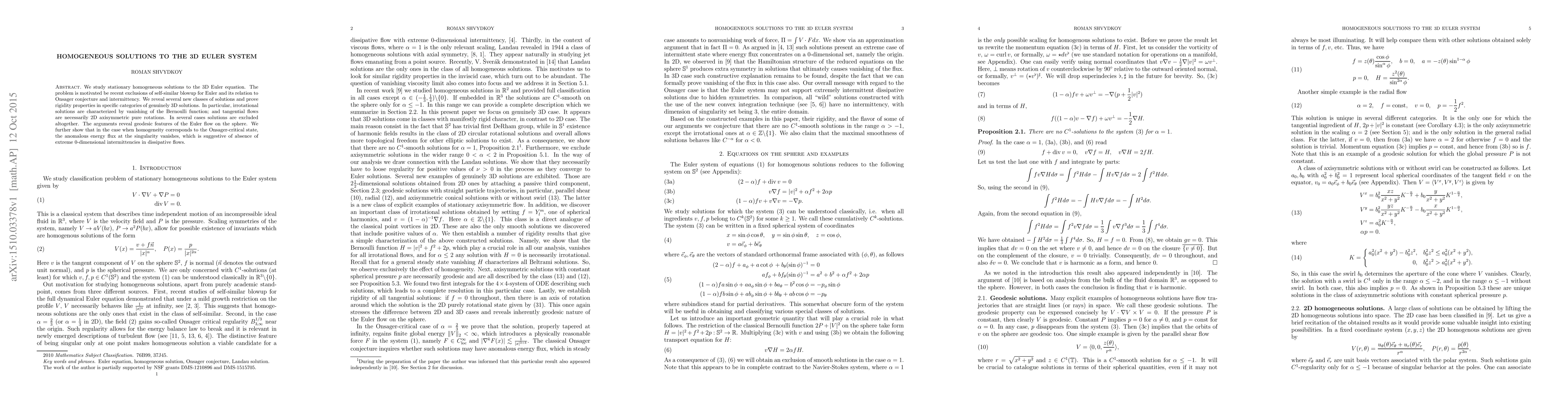 We study stationary homogeneous solutions to the 3D Euler equation. The problem is motivated be recent exclusions of self-similar blowup for Euler and its relation to Onsager conjecture and intermittency. We reveal several new classes of solutions and prove rigidity properties in specific categories of genuinely 3D solutions. In particular, irrotational solutions are characterized by vanishing of the Bernoulli function; and tangential flows are necessarily 2D axisymmetric pure rotations. In several cases solutions are excluded altogether. The arguments reveal geodesic features of the Euler flow on the sphere. We further show that in the case when homogeneity corresponds to the Onsager-critical state, the anomalous energy flux at the singularity vanishes, which is suggestive of absence of extreme $0$-dimensional intermittencies in dissipative flows.