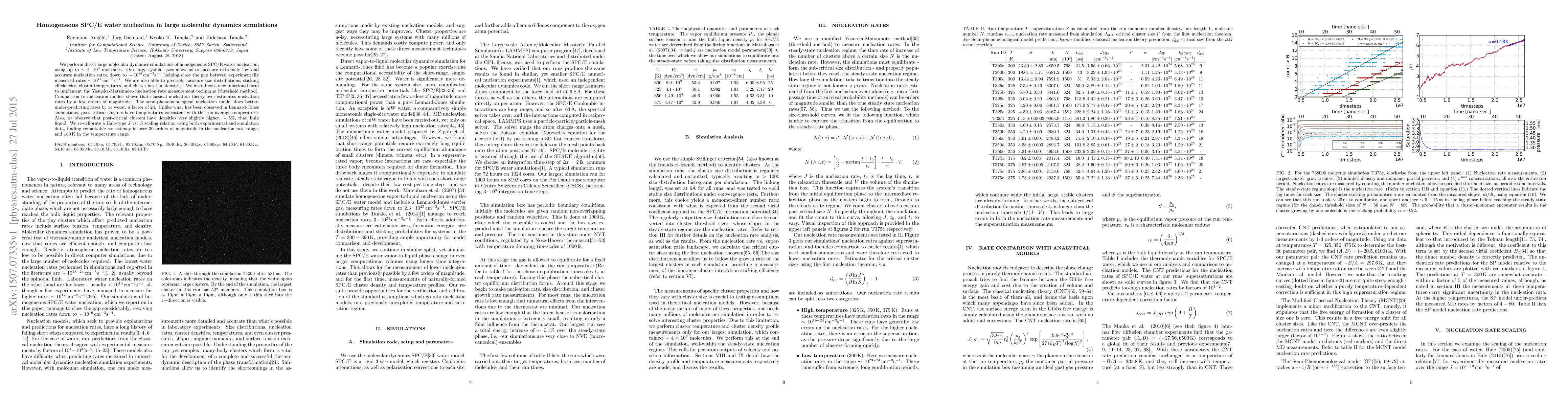 We perform direct large molecular dynamics simulations of homogeneous SPC/E water nucleation, using up to $\sim 4\cdot 10^6$ molecules. Our large system sizes allow us to measure extremely low and accurate nucleation rates, down to $\sim 10^{19}\,\textrm{cm}^{-3}\textrm{s}^{-1}$, helping close the gap between experimentally measured rates $\sim 10^{17}\,\textrm{cm}^{-3}\textrm{s}^{-1}$. We are also able to precisely measure size distributions, sticking efficiencies, cluster temperatures, and cluster internal densities. We introduce a new functional form to implement the Yasuoka-Matsumoto nucleation rate measurement technique (threshold method). Comparison to nucleation models shows that classical nucleation theory over-estimates nucleation rates by a few orders of magnitude. The semi-phenomenological nucleation model does better, under-predicting rates by at worst, a factor of 24. Unlike what has been observed in Lennard-Jones simulations, post-critical clusters have temperatures consistent with the run average temperature. Also, we observe that post-critical clusters have densities very slightly higher, $\sim 5\%$, than bulk liquid. We re-calibrate a Hale-type $J$ vs. $S$ scaling relation using both experimental and simulation data, finding remarkable consistency in over $30$ orders of magnitude in the nucleation rate range, and $180\,$K in the temperature range.