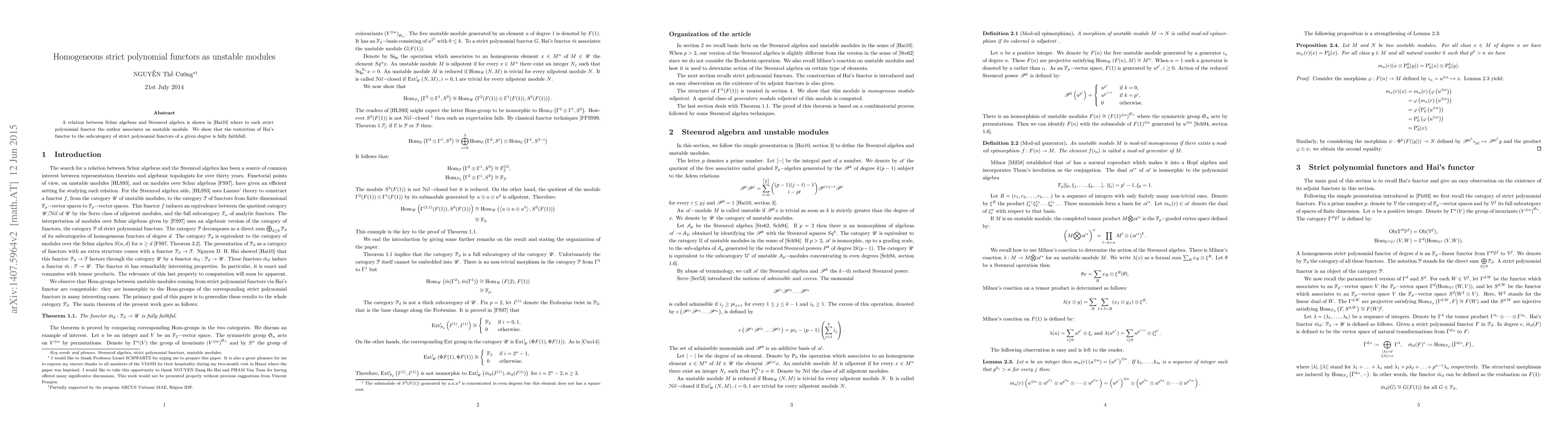 This paper establishes a connection between Schur algebras and the Steenrod algebra by associating strict polynomial functors with unstable modules. It demonstrates that the restriction of Hai's functor to the subcategory of functors of a specific degree is fully faithful.