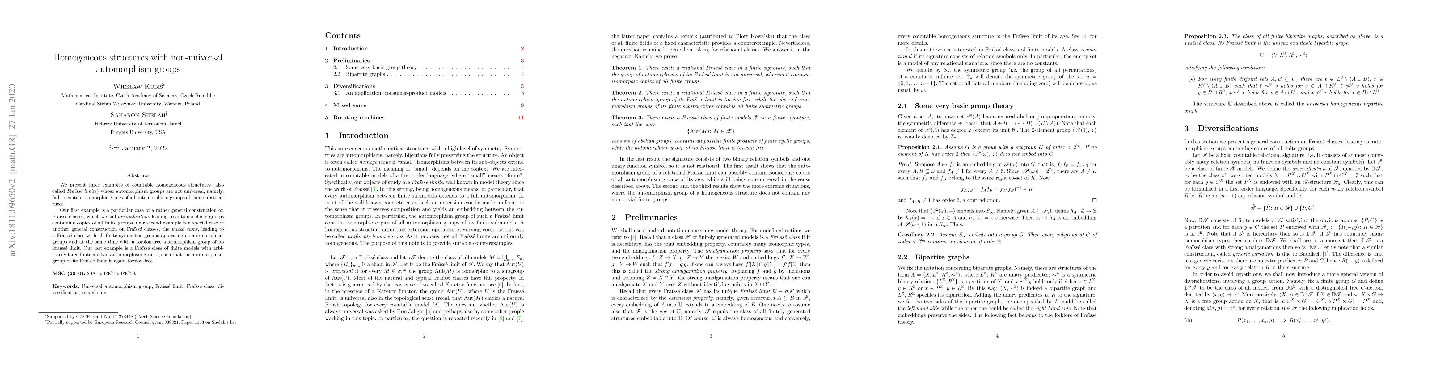 We present three examples of countable homogeneous structures (also called Fraisse limits) whose automorphism groups are not universal, namely, fail to contain isomorphic copies of all automorphism groups of their substructures. Our first example is a particular case of a rather general construction on Fraisse classes, which we call diversification, leading to automorphism groups containing copies of all finite groups. Our second example is a special case of another general construction on Fraisse classes, the mixed sums, leading to a Fraisse class with all finite symmetric groups appearing as automorphism groups and at the same time with a torsion-free automorphism group of its Fraisse limit. Our last example is a Fraisse class of finite models with arbitrarily large finite abelian automorphism groups, such that the automorphism group of its Fraisse limit is again torsion-free.