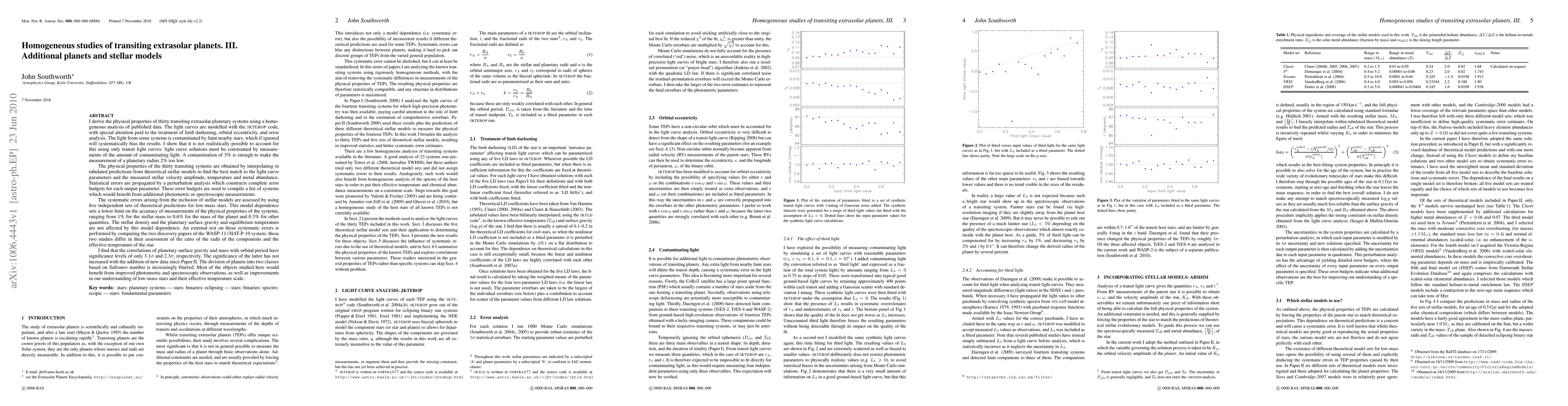 I derive the physical properties of 30 transiting extrasolar planetary systems using a homogeneous analysis of published data. The light curves are modelled with the JKTEBOP code, with attention paid to limb darkening and eccentricity. The light from some systems is contaminated by faint nearby stars, which if ignored will systematically bias the results. I show that this must be accounted for using external measurements of the amount of contaminating light. A contamination of 5% is enough to make the measurement of a planetary radius 2% too low. The physical properties of the 30 transiting systems are obtained by interpolating in stellar model predictions to find the best match to their measured quantities. The error budgets are used to compile a list of systems which would benefit from additional observations. The systematic errors arising from the inclusion of stellar models are assessed by using five different theoretical models. This model dependence sets a lower limit on the accuracy of measurements of the system properties, and at worst is 1% for the stellar mass. The correlations of planetary surface gravity and mass with orbital period have significance levels of only 3.1 sigma and 2.3 sigma. The division of planets into two classes based on Safronov number is increasingly blurred. Most of the objects studied here would benefit from more photometry and/or spectroscopy, as well as a better understanding of low-mass stars.