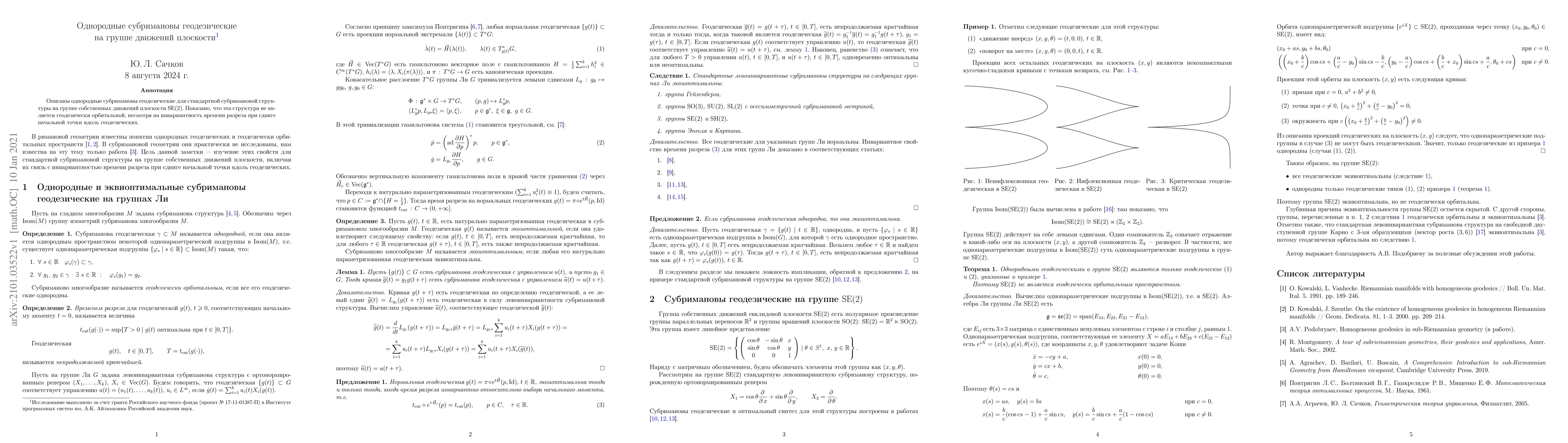 Summary: This paper explores homogeneous sub-Riemannian geodesics on the group of plane motions SE(2), demonstrating that despite the invariance of the cut time under initial point shifts, the structure is not geodesically orbital.