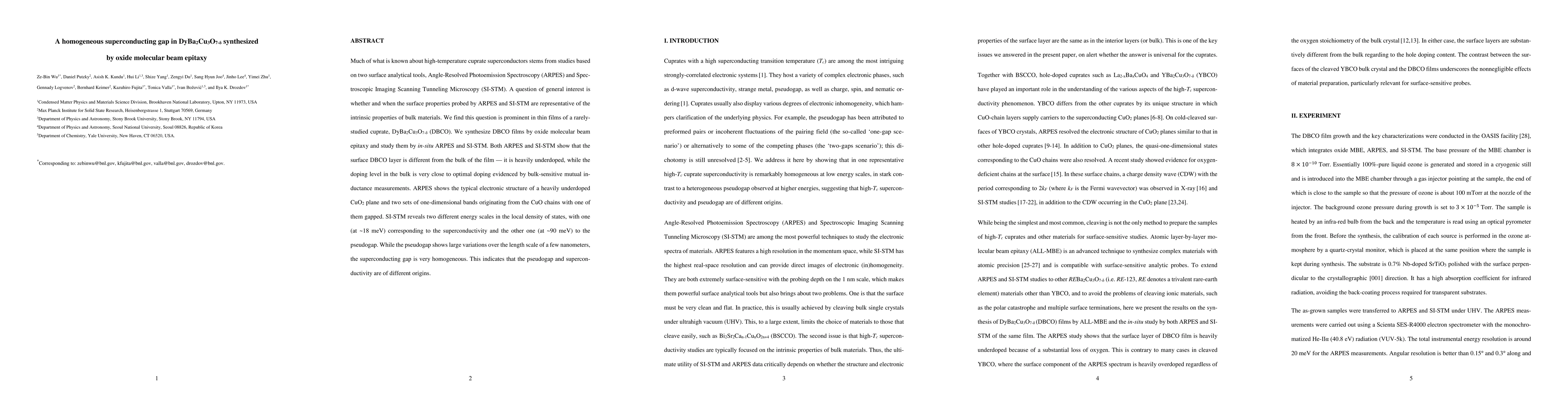 Much of what is known about high-temperature cuprate superconductors stems from studies based on two surface analytical tools, angle-resolved photoemission spectroscopy (ARPES) and spectroscopic imaging scanning tunneling microscopy (SI-STM). A question of general interest is whether and when the surface properties probed by ARPES and SI-STM are representative of the intrinsic properties of bulk materials. We find this question is prominent in thin films of a rarely studied cuprate DBCO. We synthesize DBCO films by oxide molecular beam epitaxy and study them by in situ ARPES and SI-STM. Both ARPES and SI-STM show that the surface DBCO layer is different from the bulk of the film. It is heavily underdoped, while the doping level in the bulk is close to optimal doping evidenced by bulk-sensitive mutual inductance measurements. ARPES shows the typical electronic structure of a heavily underdoped CuO2 plane and two sets of one-dimensional bands originating from the CuO chains with one of them gapped. SI-STM reveals two different energy scales in the local density of states, with one corresponding to the superconductivity and the other one to the pseudogap. While the pseudogap shows large variations over the length scale of a few nanometers, the superconducting gap is very homogeneous. This indicates that the pseudogap and superconductivity are of different origins.