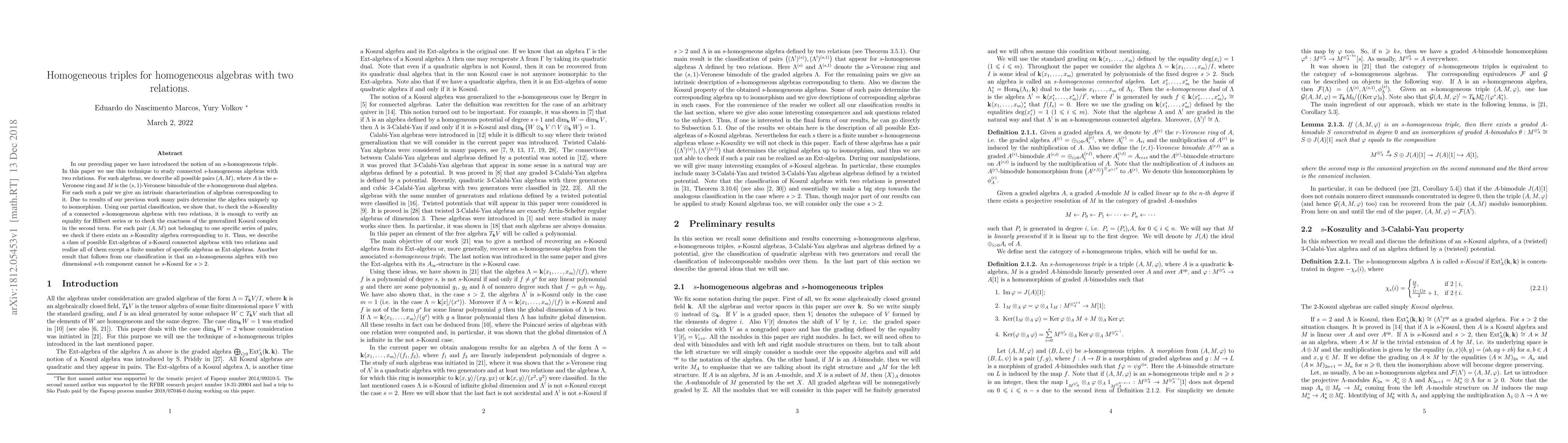 This paper investigates connected $s$-homogeneous algebras with two relations, introducing a technique based on $s$-homogeneous triples to classify them. It provides intrinsic characterizations of corresponding algebras and shows that $s$-Koszulity can be determined through specific checks on Hilbert series or Koszul complex exactness. The study concludes that most algebras realize as ${\rm Ext}$-algebras except a few specific cases, and $s$-homogeneous algebras with a two-dimensional $s$-th component are non-$s$-Koszul for $s>2$.