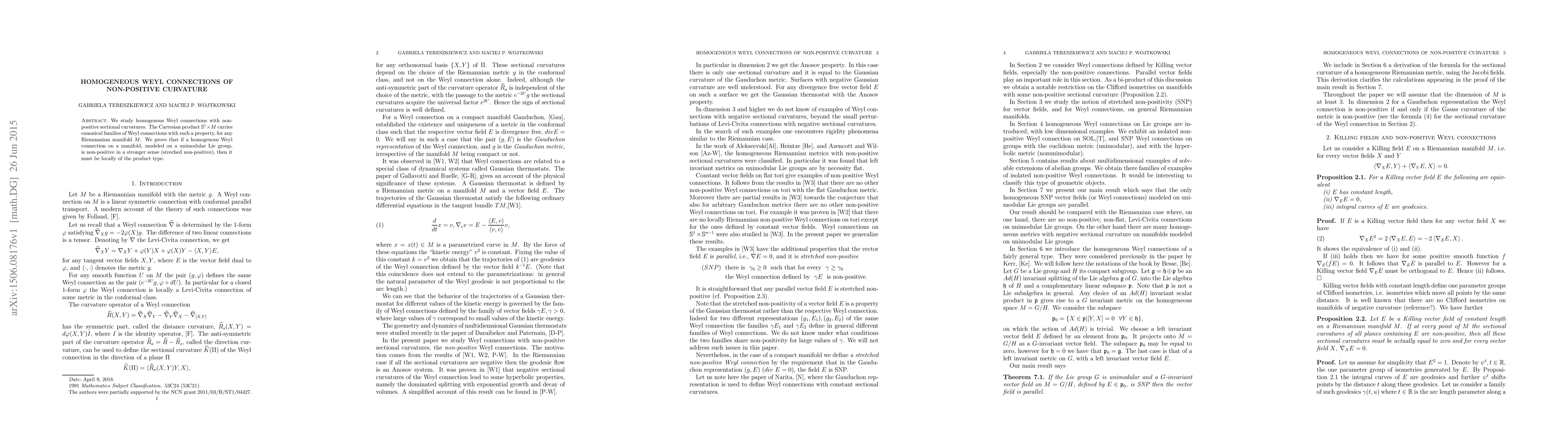 We study homogenous Weyl connections with non-positive sectional curvatures. The Cartesian product $\mathbb S^1 \times M$ carries canonical families of Weyl connections with such a property, for any Riemmanian manifold $M$. We prove that if a homogenous Weyl connection on a manifold, modeled on a unimodular Lie group, is non-positive in a stronger sense (streched non-positive), then it must be locally of the product type.