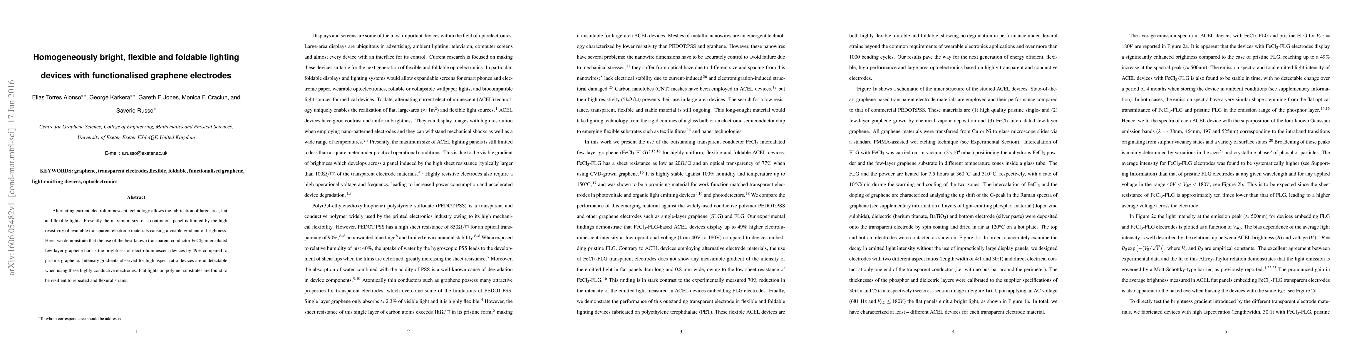 Alternating current electroluminescent technology allows the fabrication of large area, flat and flexible lights. Presently the maximum size of a continuous panel is limited by the high resistivity of available transparent electrode materials causing a visible gradient of brightness. Here, we demonstrate that the use of the best known transparent conductor FeCl$_{3}$-intercalated few-layer graphene boosts the brightness of electroluminescent devices by 49$\%$ compared to pristine graphene. Intensity gradients observed for high aspect ratio devices are undetectable when using these highly conductive electrodes. Flat lights on polymer substrates are found to be resilient to repeated and flexural strains.