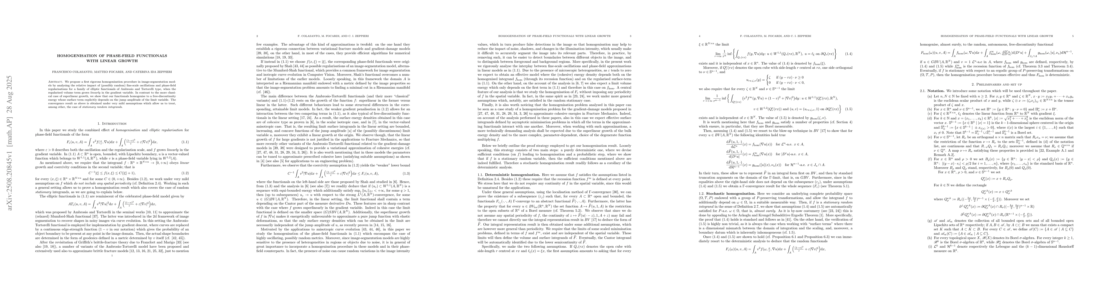 We propose a first rigorous homogenisation procedure in image-segmentation models by analysing the relative impact of (possibly random) fine-scale oscillations and phase-field regularisations for a family of elliptic functionals of Ambrosio and Tortorelli type, when the regularised volume term grows \emph{linearly} in the gradient variable. In contrast to the more classical case of superlinear growth, we show that our functionals homogenise to a free-discontinuity energy whose surface term explicitly depends on the jump amplitude of the limit variable. The convergence result as above is obtained under very mild assumptions which allow us to treat, among other, the case of \emph{stationary random integrands}.