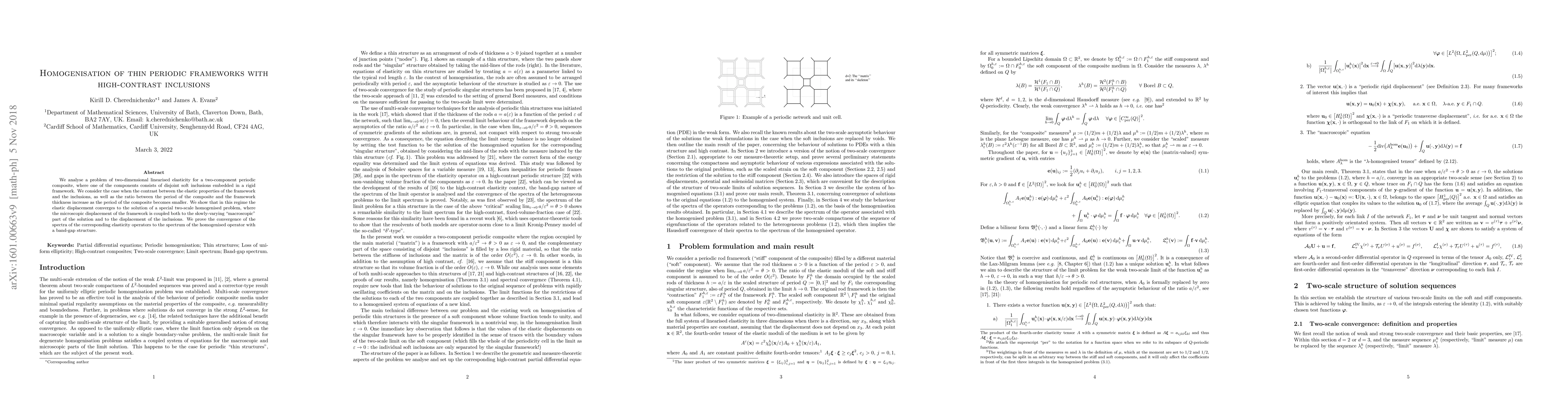 This paper studies the homogenisation of thin periodic frameworks with high-contrast soft inclusions, demonstrating that the elastic displacement converges to a solution of a two-scale problem. It also proves the convergence of the spectra of the elasticity operators to a homogenised operator with a band-gap structure.