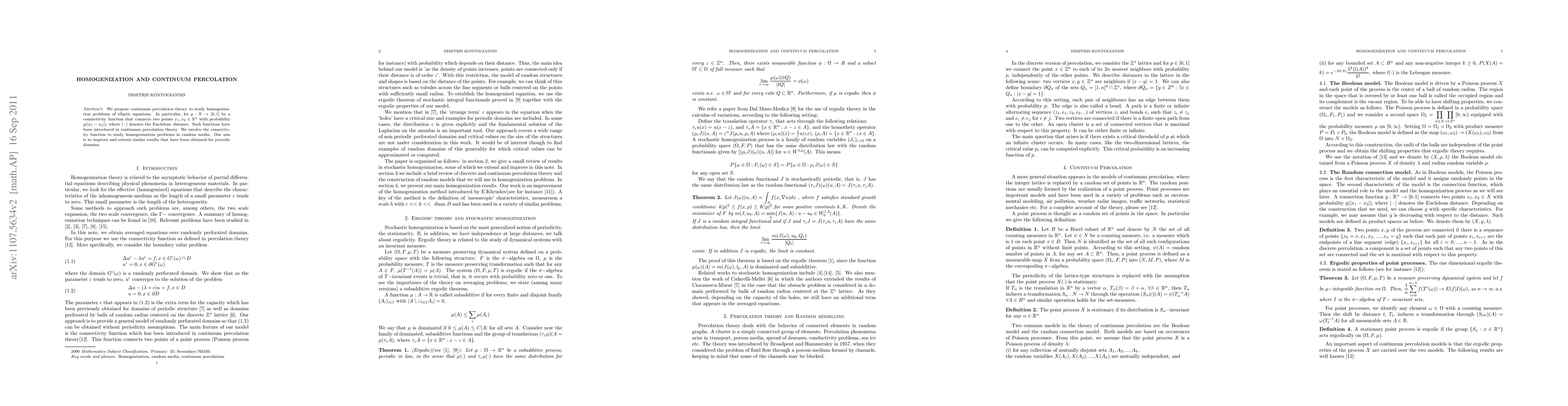 Summary: This paper introduces continuum percolation theory to enhance the study of homogenization in elliptic equations, aiming to extend previous results from periodic to non-periodic domains with ergodic properties.
