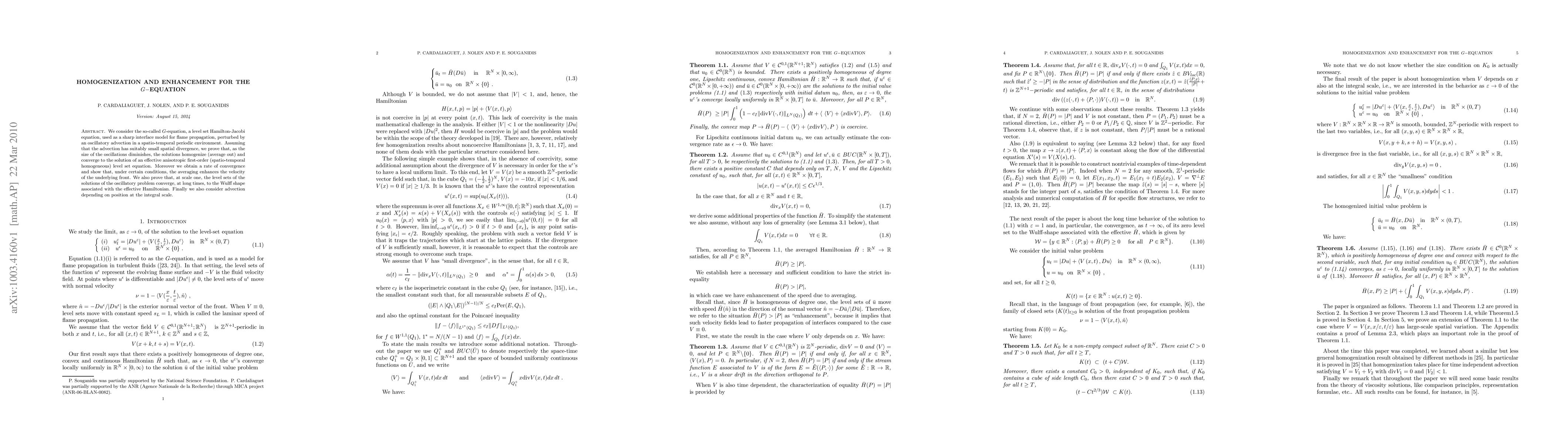 The G-equation, a model for flame propagation with oscillatory advection, converges to an effective first-order equation as the oscillations diminish, showing enhanced front velocity under certain conditions.