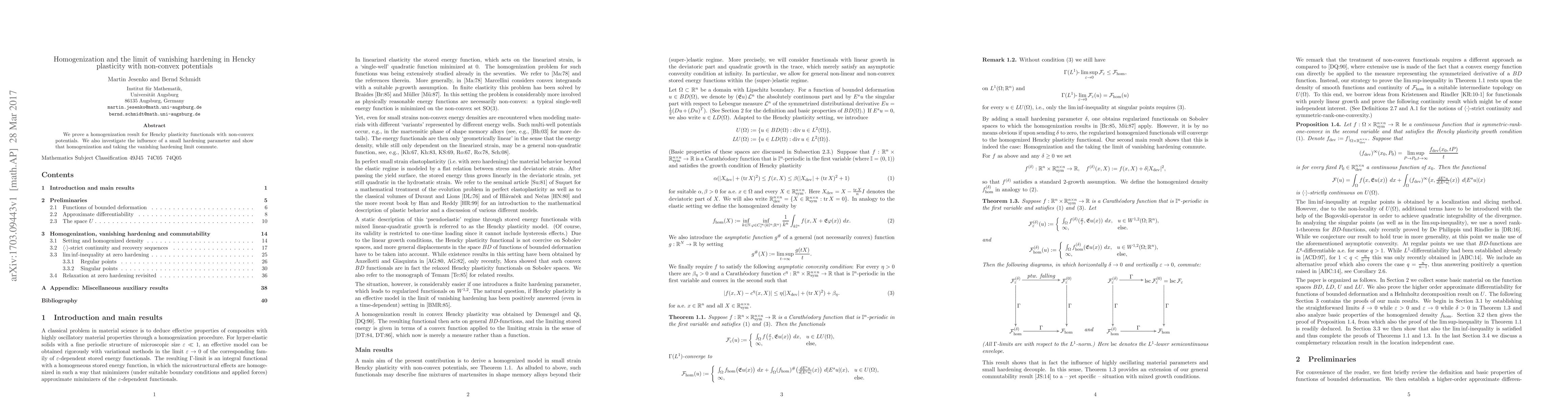 This paper proves a homogenization result for Hencky plasticity with non-convex potentials and shows that taking the vanishing hardening limit commutes with homogenization, demonstrating key findings in materials science.