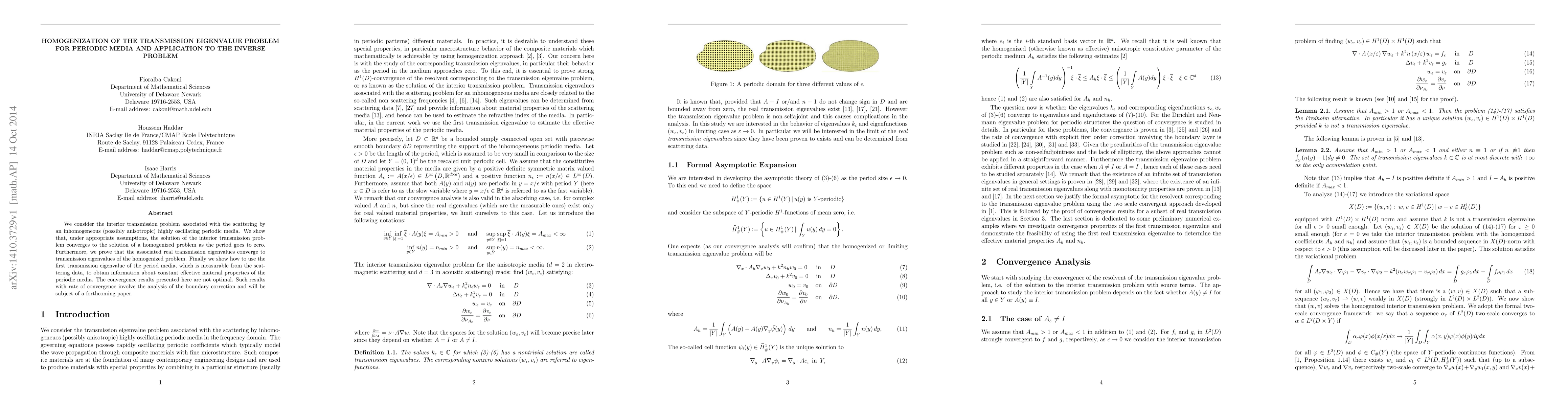 This paper investigates the homogenization of the transmission eigenvalue problem for periodic media, demonstrating convergence to a homogenized problem as the period approaches zero. It also shows how the first transmission eigenvalue, measurable from scattering data, provides insights into the effective material properties of the periodic medium.