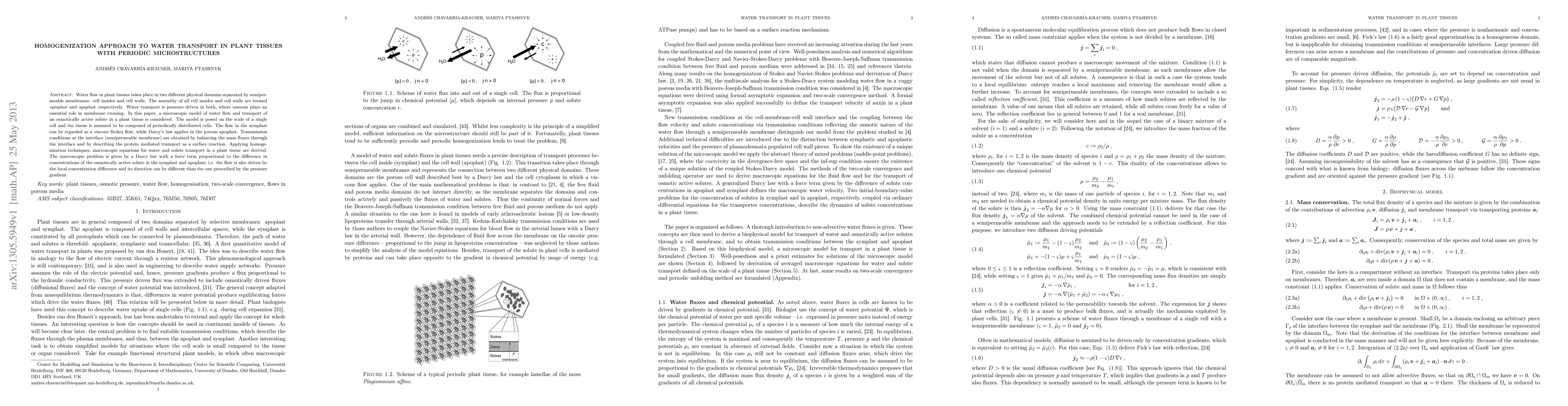 This paper develops a microscopic model to describe water and solute transport in plant tissues, employing homogenization techniques to derive macroscopic equations. The model considers the symplast and apoplast, deriving Darcy's law with an additional force term based on concentration differences, thus capturing both pressure-driven and osmotically-driven flows.