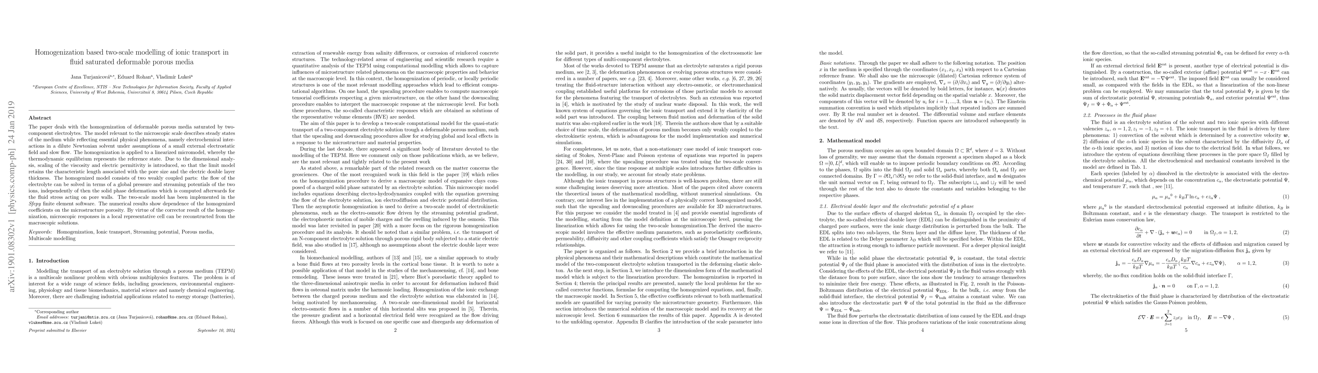 This paper develops a two-scale homogenization model for ionic transport in fluid-saturated deformable porous media, focusing on electrochemical interactions in a dilute Newtonian solvent. The model captures the coupling between fluid flow and ionic transport, and demonstrates the dependence of homogenized coefficients on microstructure porosity.