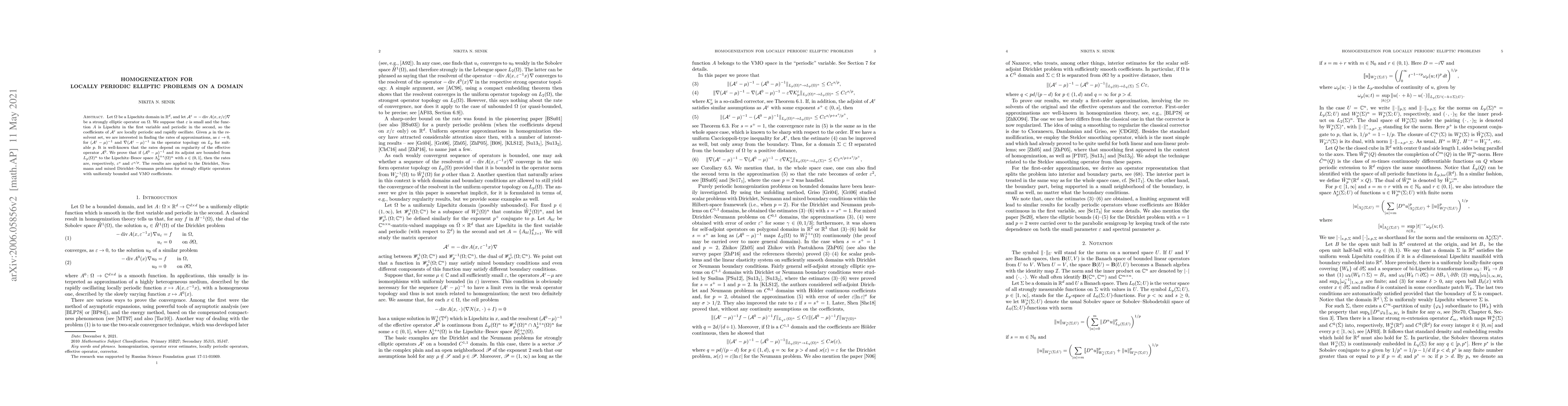 Let $\Omega$ be a Lipschitz domain in $\mathbb R^d$, and let $\mathcal A^\varepsilon=-\operatorname{div}A(x,x/\varepsilon)\nabla$ be a strongly elliptic operator on $\Omega$. We suppose that $\varepsilon$ is small and the function $A$ is Lipschitz in the first variable and periodic in the second, so the coefficients of $\mathcal A^\varepsilon$ are locally periodic and rapidly oscillate. Given $\mu$ in the resolvent set, we are interested in finding the rates of approximations, as $\varepsilon\to0$, for $(\mathcal A^\varepsilon-\mu)^{-1}$ and $\nabla(\mathcal A^\varepsilon-\mu)^{-1}$ in the operator topology on $L_p$ for suitable $p$. It is well-known that the rates depend on regularity of the effective operator $\mathcal A^0$. We prove that if $(\mathcal A^0-\mu)^{-1}$ and its adjoint are bounded from $L_p(\Omega)^n$ to the Lipschitz--Besov space $\Lambda_p^{1+s}(\Omega)^n$ with $s\in(0,1]$, then the rates are, respectively, $\varepsilon^s$ and $\varepsilon^{s/p}$. The results are applied to the Dirichlet, Neumann and mixed Dirichlet--Neumann problems for strongly elliptic operators with uniformly bounded and $\operatorname{VMO}$ coefficients.