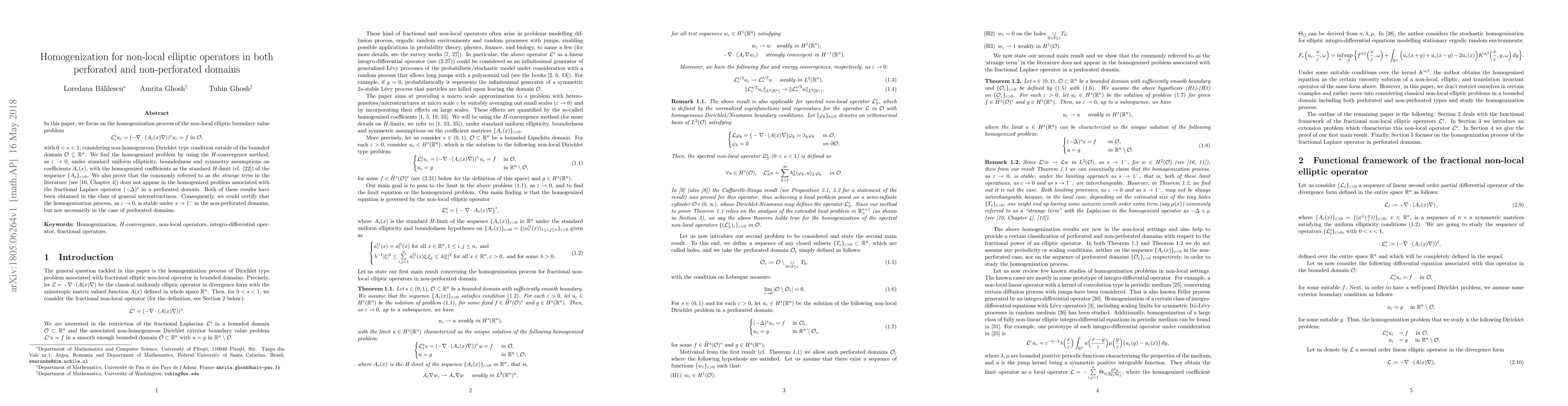 This paper studies the homogenization of non-local elliptic operators with non-locality parameter $0<s<1$, focusing on the fractional Laplace operator $(-\Delta)^s$. It employs the $H$-convergence method to derive the homogenized problem, proving stability in non-perforated domains but not in perforated ones, and shows that the "strange term" does not appear in the homogenized problem for the fractional Laplace operator.