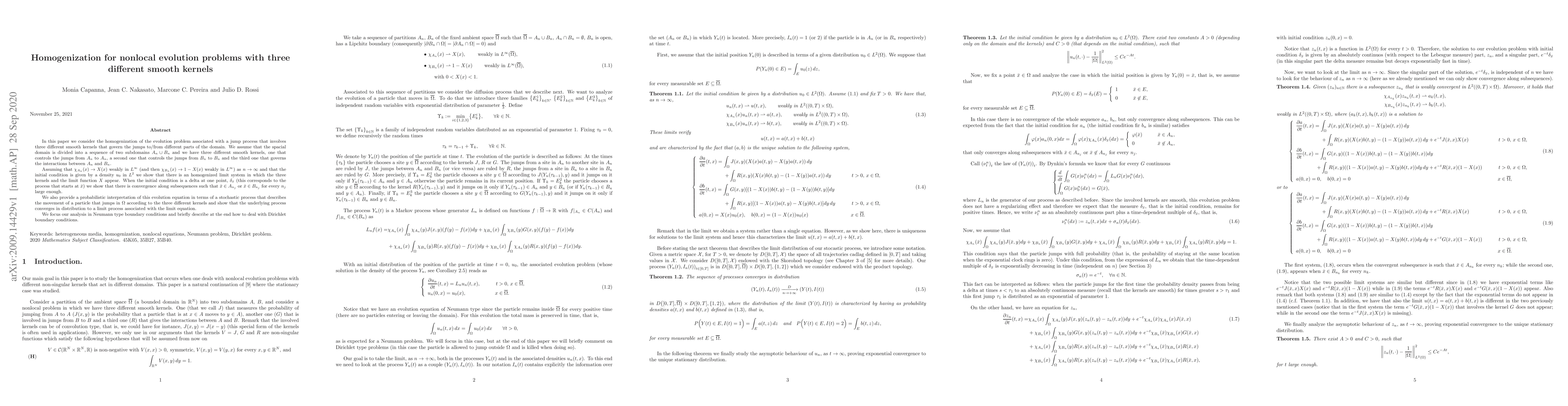In this paper we consider the homogenization of the evolution problem associated with a jump process that involves three different smooth kernels that govern the jumps to/from different parts of the domain. We assume that the spacial domain is divided into a sequence of two subdomains $A_n \cup B_n$ and we have three different smooth kernels, one that controls the jumps from $A_n$ to $A_n$, a second one that controls the jumps from $B_n$ to $B_n$ and the third one that governs the interactions between $A_n$ and $B_n$.Assuming that $\chi_{A_n} (x) \to X(x)$ weakly in $L^\infty$ (and then $\chi_{B_n} (x) \to 1-X(x)$ weakly in $L^\infty$) as $n \to \infty$ and that the initial condition is given by a density $u_0$ in $L^2$ we show that there is an homogenized limit system in which the three kernels and the limit function $X$ appear. When the initial condition is a delta at one point, $\delta_{\bar{x}}$ (this corresponds to the process that starts at $\bar{x}$) we show that there is convergence along subsequences such that $\bar{x} \in A_{n_j}$ or $\bar{x} \in B_{n_j}$ for every $n_j$ large enough. We also provide a probabilistic interpretation of this evolution equation in terms of a stochastic process that describes the movement of a particle that jumps in $\Omega$ according to the three different kernels and show that the underlying process converges in distribution to a limit process associated with the limit equation. We focus our analysis in Neumann type boundary conditions and briefly describe at the end how to deal with Dirichlet boundary conditions.