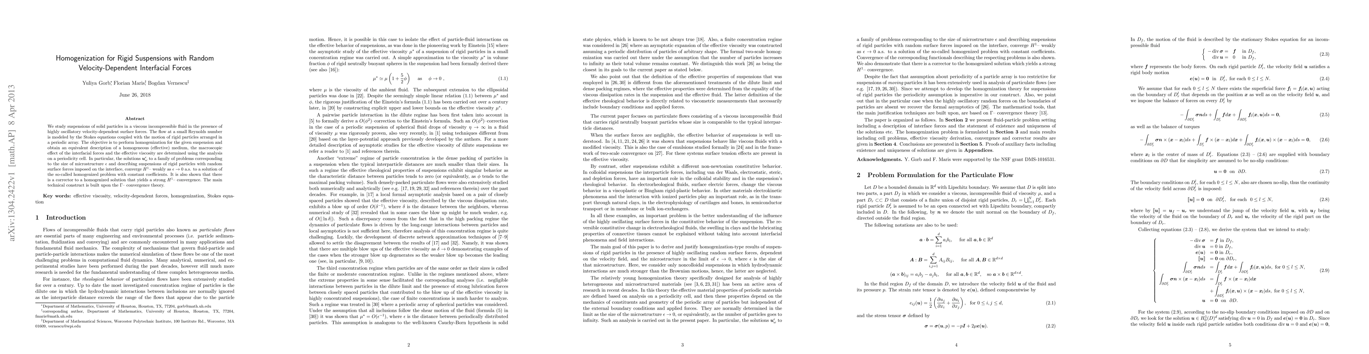 This paper investigates suspensions of rigid particles in a viscous fluid under random, velocity-dependent interfacial forces, aiming to derive an effective medium description. It employs homogenization techniques to determine the macroscopic effects of these forces and the effective viscosity, showing convergence of solutions to a homogenized problem with a corrector for strong convergence.
