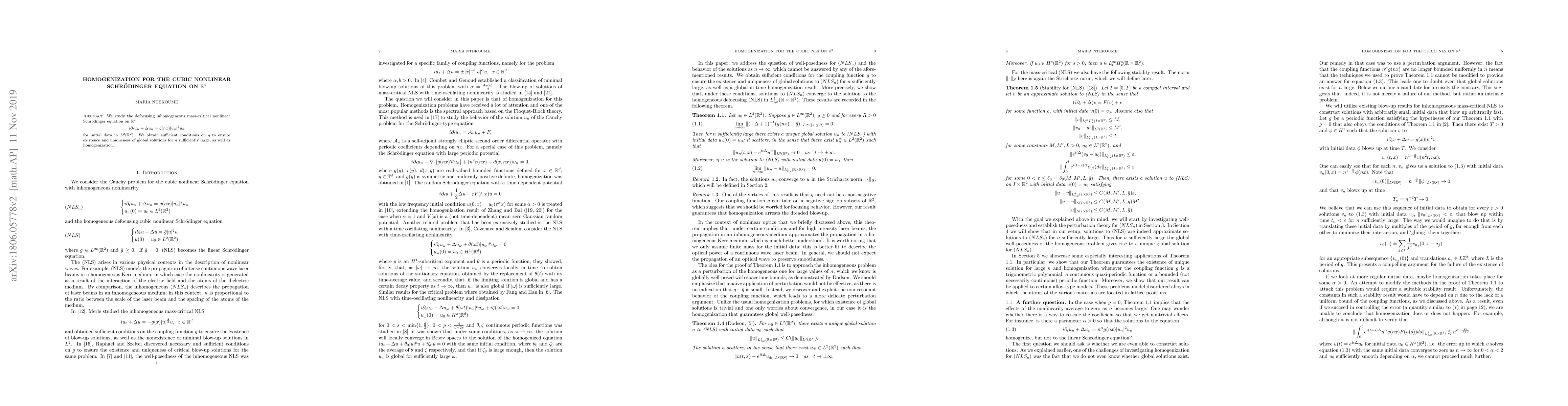 This paper investigates the existence and uniqueness of global solutions for the cubic nonlinear Schrödinger equation in $\mathbb R^2$ under large scaling parameters, and establishes conditions for homogenization of the equation.