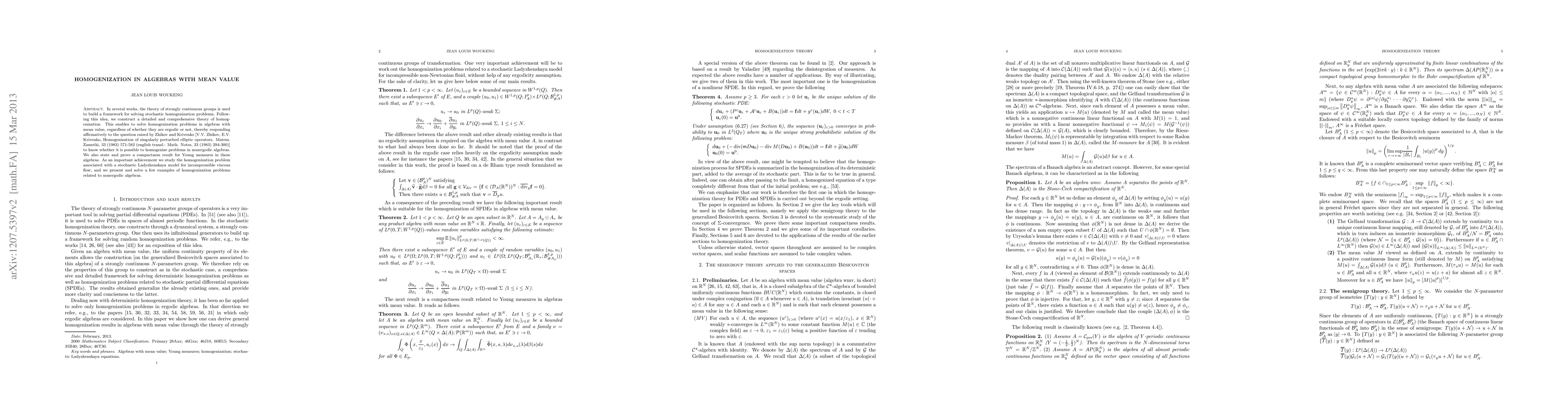 This paper develops a comprehensive theory of homogenization in algebras with mean value, addressing the question of whether nonergodic algebras can be homogenized. It proves a compactness result for Young measures and solves examples of homogenization problems, including a stochastic Ladyzhenskaya model for incompressible viscous flow.
