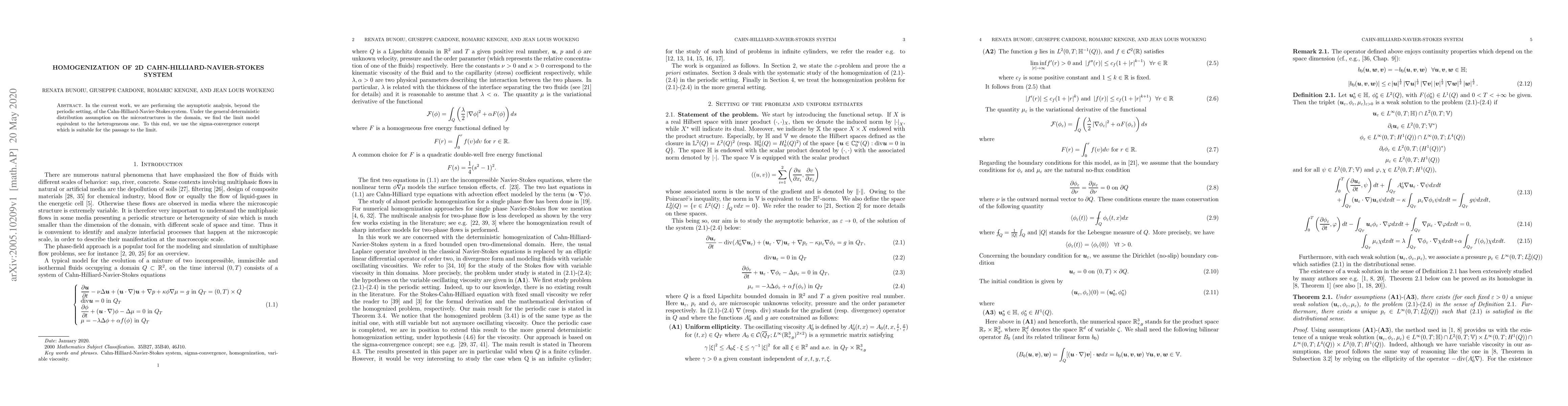 In the current work, we are performing the asymptotic analysis, beyond the periodic setting, of the Cahn-Hilliard-Navier-Stokes system. Under the general deterministic distribution assumption on the microstructures in the domain, we find the limit model equivalent to the heterogeneous one. To this end, we use the sigma-convergence concept which is suitable for the passage to the limit.