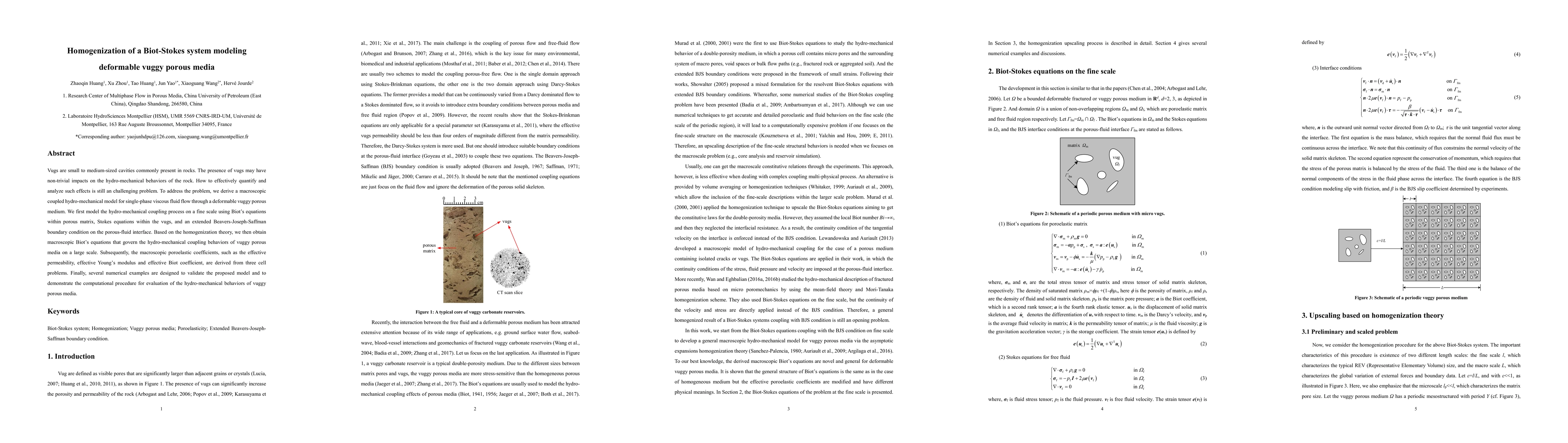 This paper develops a macroscopic poroelastic model for fluid flow through deformable vuggy porous media, employing homogenization theory to derive effective parameters from fine-scale Biot-Stokes systems. The study uses Biot's and Stokes equations to model hydro-mechanical coupling and computes macroscopic coefficients through cell problems.