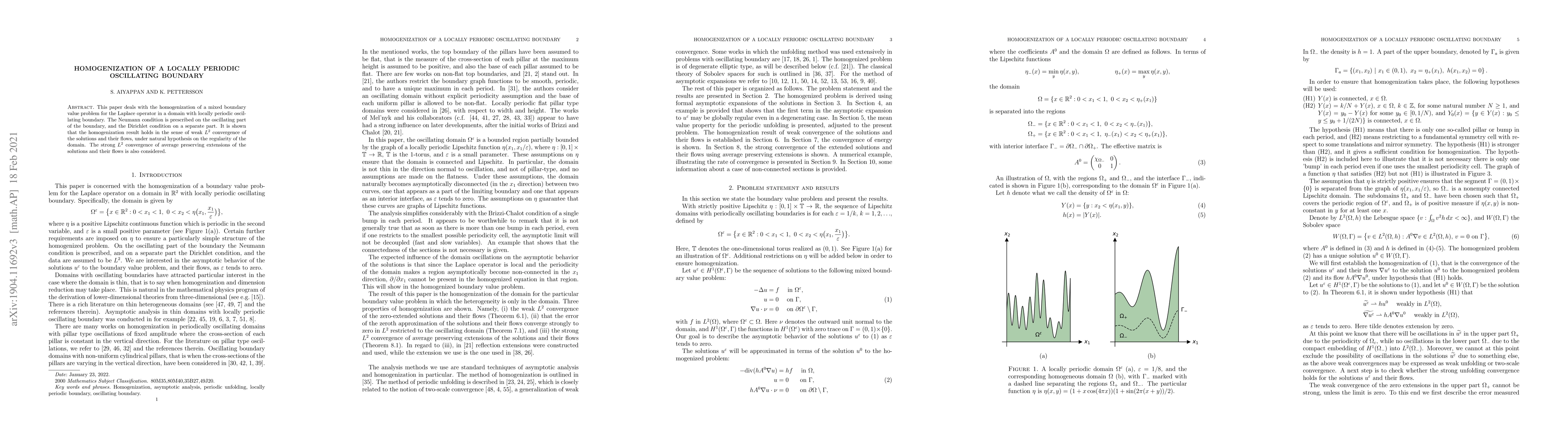 This paper studies the homogenization of a mixed boundary value problem for the Laplace operator in a domain with a locally periodic oscillating boundary, proving weak $L^2$ convergence of solutions and their flows under domain regularity conditions, and also considering strong $L^2$ convergence of average-preserving extensions.