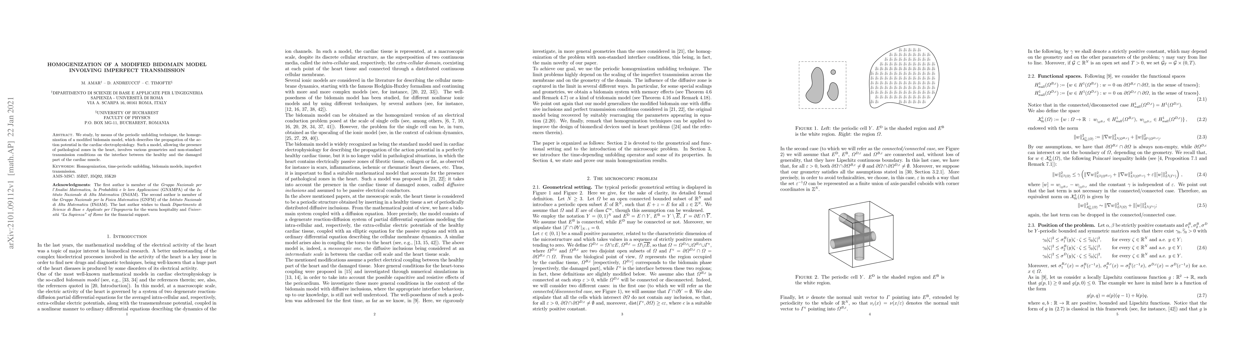 This paper uses periodic unfolding to homogenize a modified bidomain model for cardiac electrophysiology, focusing on action potential propagation in the presence of pathological regions with non-standard transmission conditions at the interface between healthy and damaged cardiac tissue.