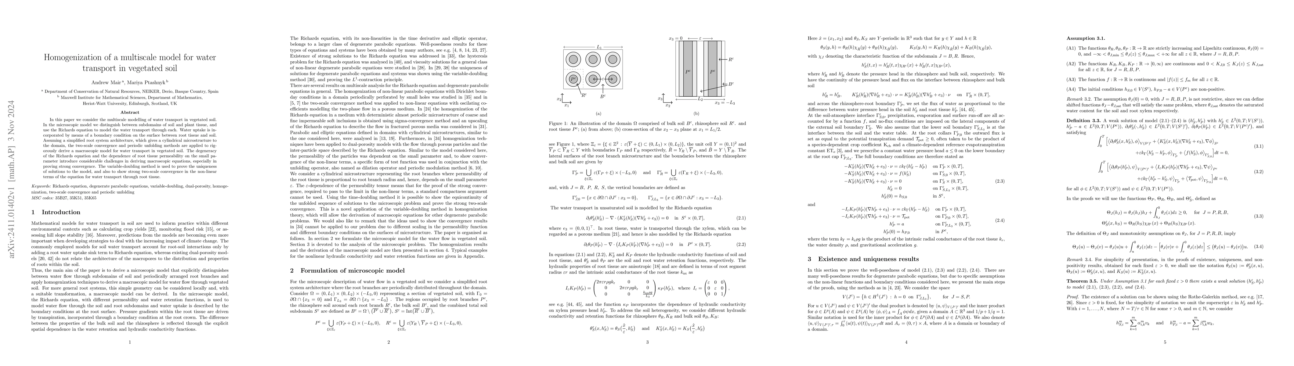 This paper develops a multiscale model for water transport in vegetated soil, distinguishing between soil and plant tissue using the Richards equation, and applies homogenization techniques to derive a macroscopic model, addressing challenges related to equation degeneracy and variable permeability. The variable-doubling method proves solution uniqueness and strong convergence.