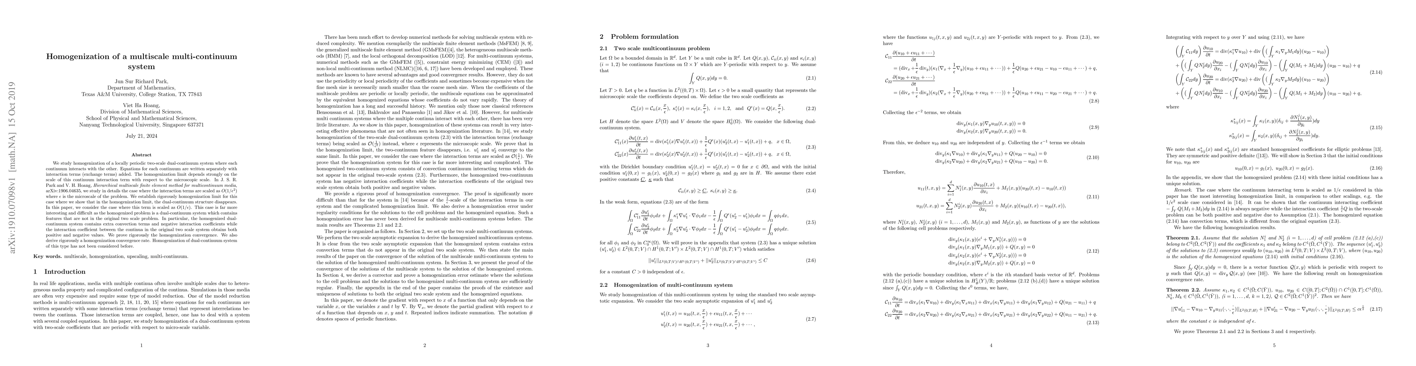 We study homogenization of a locally periodic two-scale dual-continuum system where each continuum interacts with the other. Equations for each continuum are written separately with interaction terms (exchange terms) added. The homogenization limit depends strongly on the scale of this continuum interaction term with respect to the microscopic scale. In J. S. R. Park and V. H. Hoang, {\it Hierarchical multiscale finite element method for multicontinuum media}, arXiv:1906.04635, we study in details the case where the interaction terms are scaled as $O(1/\ep^2)$ where $\ep$ is the microscale of the problem. We establish rigorously homogenization limit for this case where we show that in the homogenization limit, the dual-continuum structure disappears. In this paper, we consider the case where this term is scaled as $O(1/\ep)$. This case is far more interesting and difficult as the homogenized problem is a dual-continuum system which contains features that are not in the original two scale problem. In particular, the homogenized dual-continuum system contains extra convection terms and negative interaction coefficients while the interaction coefficient between the continua in the original two scale system obtains both positive and negative values. We prove rigorously the homogenization convergence. We also derive rigorously a homogenization convergence rate. Homogenization of dual-continuum system of this type has not been considered before.