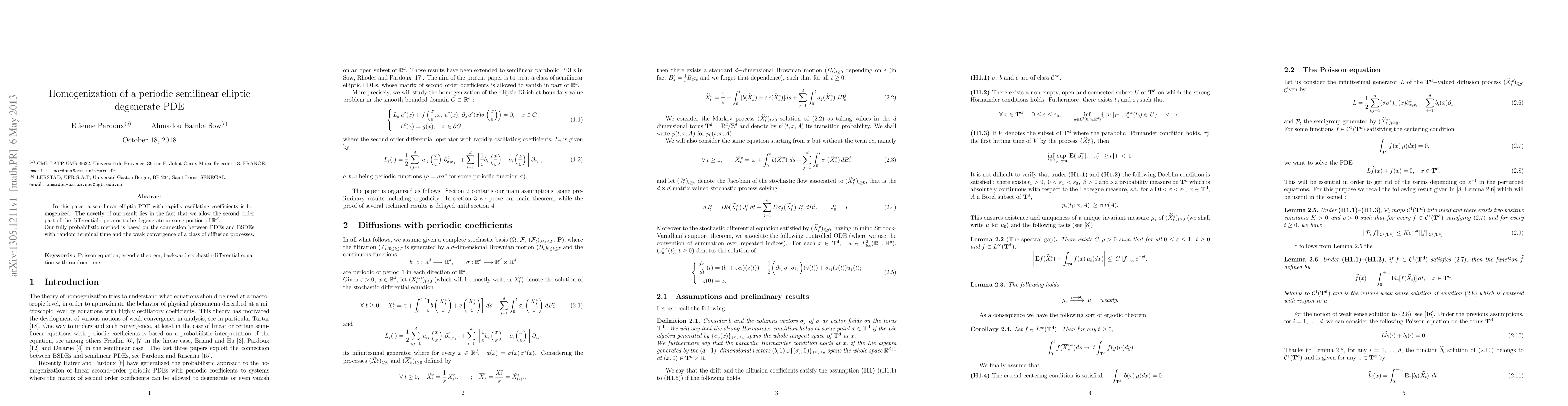 In this paper a semilinear elliptic PDE with rapidly oscillating coefficients is homogenized. The novetly of our result lies in the fact that we allow the second order part of the differential operator to be degenerate in some portion of $\R^d$.\\ Our fully probabilistic method is based on the connection between PDEs and BSDEs with random terminal time and the weak convergence of a class of diffusion processes.
