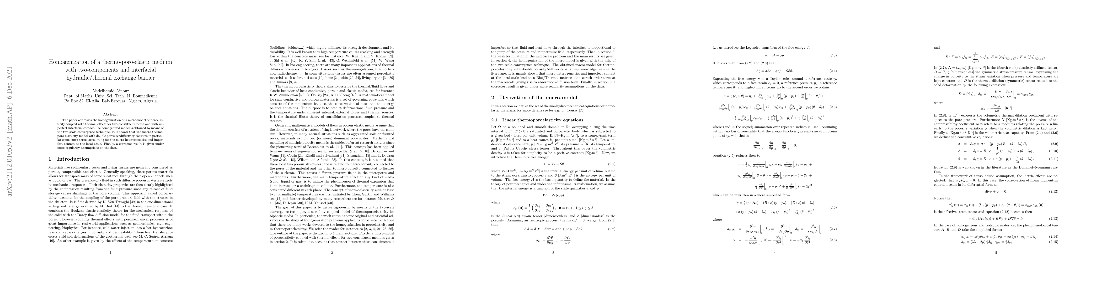 The paper addresses the homogenization of a micro-model of poroelasticity coupled with thermal effects for two-constituent media and with imperfect interfacial contact.The homogenized model is obtained by means of the two-scale convergence technique. It is shown that the macro-thermo-poro-elasticity model with double porosity/diffusivity contains in particular some extra terms accounting for the micro-heterogeneities and imperfect contact at the local scale. Finally, a corrector result is given under more regularity assumptions on the data.