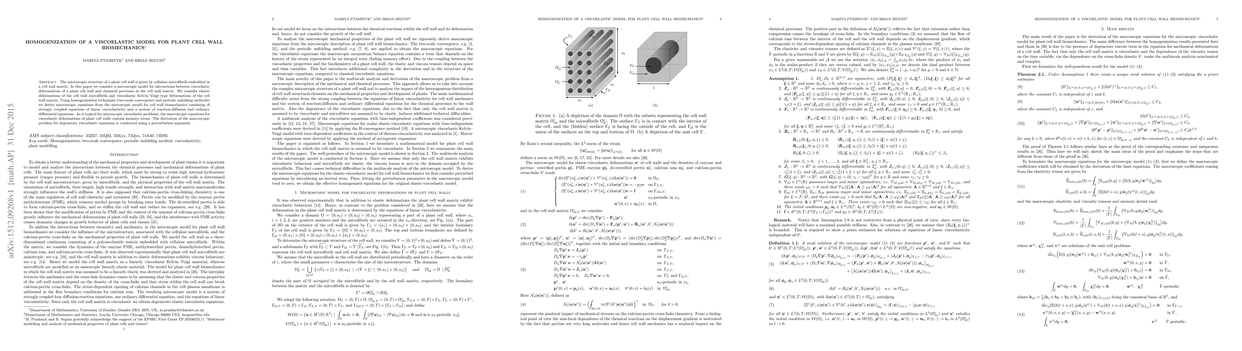 This paper develops macroscopic equations for plant cell wall biomechanics by homogenizing a microscopic viscoelastic model. It combines elastic deformations of cellulose microfibrils with viscoelastic Kelvin-Voigt behavior of the cell wall matrix, leading to coupled linear viscoelasticity and reaction-diffusion equations with memory terms.