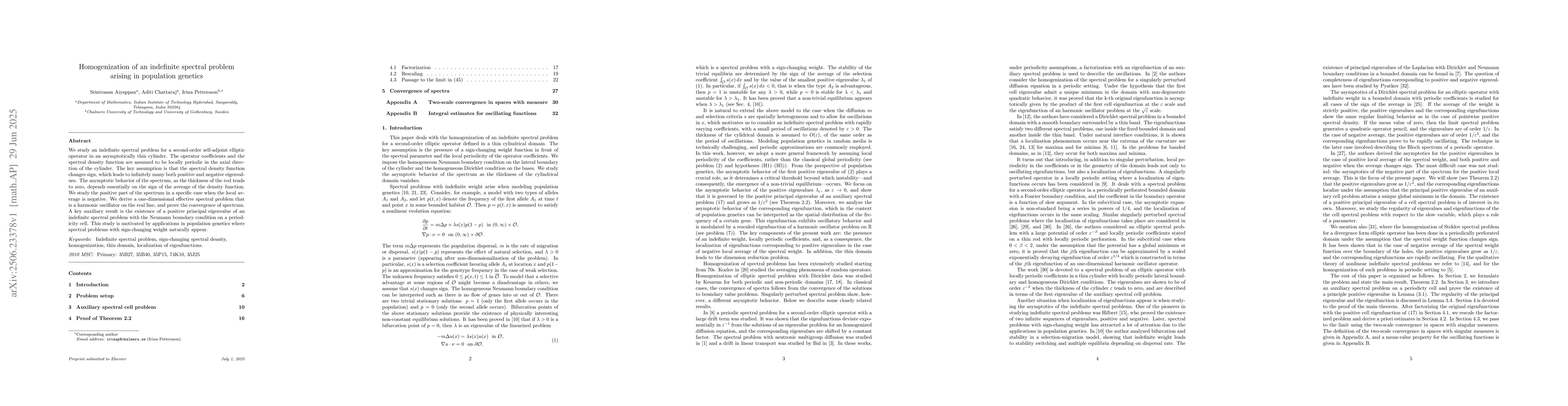 We study an indefinite spectral problem for a second-order self-adjoint elliptic operator in an asymptotically thin cylinder. The operator coefficients and the spectral density function are assumed to be locally periodic in the axial direction of the cylinder. The key assumption is that the spectral density function changes sign, which leads to infinitely many both positive and negative eigenvalues. The asymptotic behavior of the spectrum, as the thickness of the rod tends to zero, depends essentially on the sign of the average of the density function. We study the positive part of the spectrum in a specific case when the local average is negative. We derive a one-dimensional effective spectral problem that is a harmonic oscillator on the real line, and prove the convergence of spectrum. A key auxiliary result is the existence of a positive principal eigenvalue of an indefinite spectral problem with the Neumann boundary condition on a periodicity cell. This study is motivated by applications in population genetics where spectral problems with sign-changing weight naturally appear.