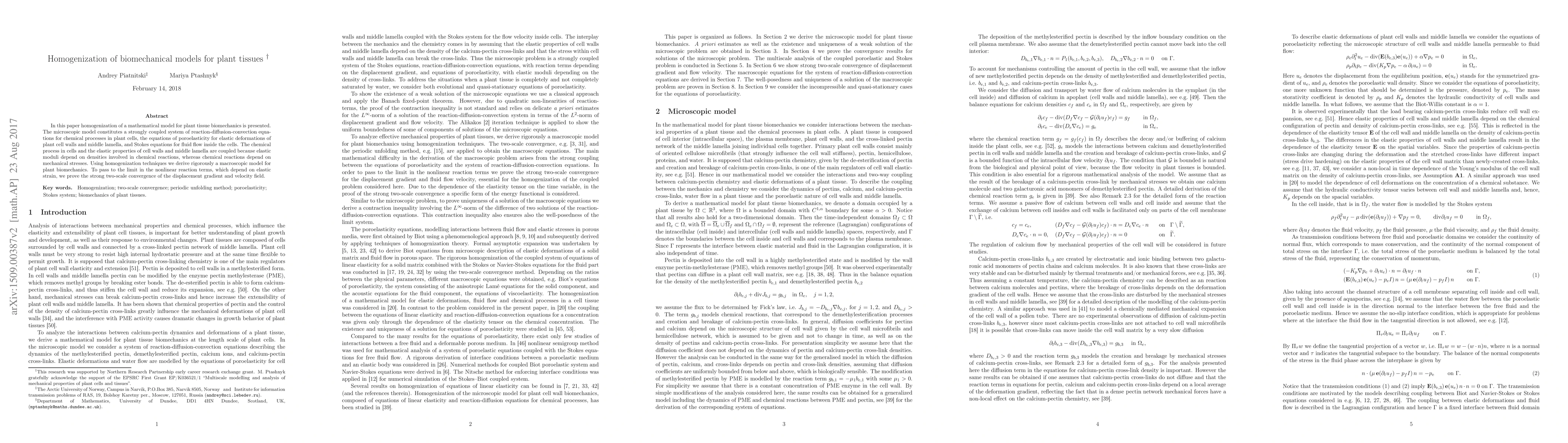 This paper develops a homogenization method to derive a macroscopic model from a microscopic model of plant tissue biomechanics, which includes reaction-diffusion-convection equations, poroelasticity, and fluid flow. The authors prove strong two-scale convergence to handle the nonlinear reaction terms dependent on elastic strain.