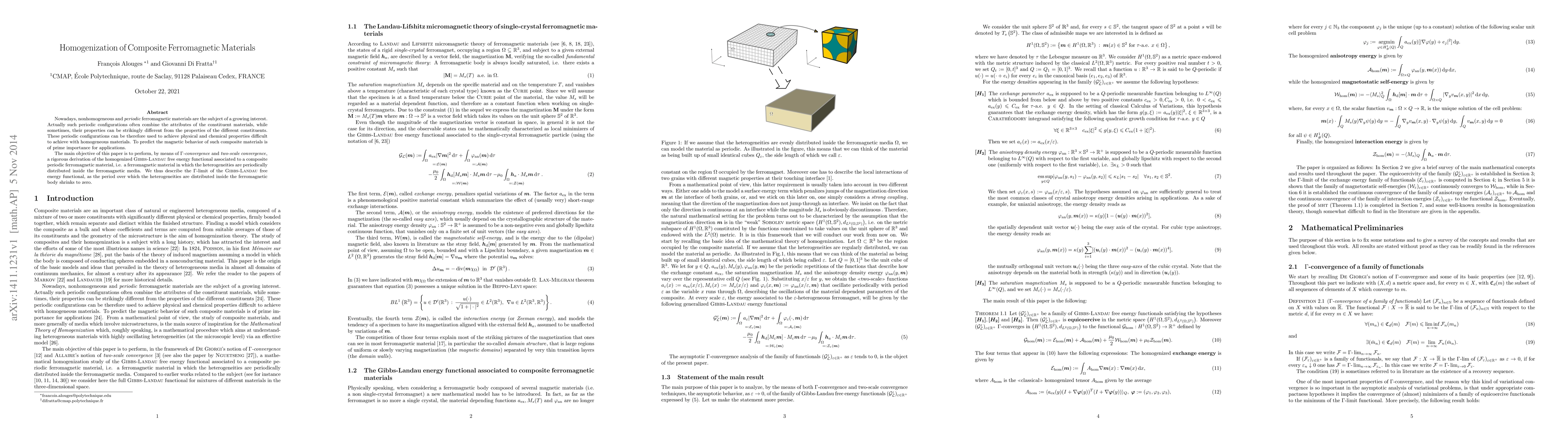 Nowadays, nonhomogeneous and periodic ferromagnetic materials are the subject of a growing interest. Actually such periodic configurations often combine the attributes of the constituent materials, while sometimes, their properties can be strikingly different from the properties of the different constituents. These periodic configurations can be therefore used to achieve physical and chemical properties difficult to achieve with homogeneous materials. To predict the magnetic behavior of such composite materials is of prime importance for applications. The main objective of this paper is to perform, by means of Gamma-convergence and two-scale convergence, a rigorous derivation of the homogenized Gibbs-Landau free energy functional associated to a composite periodic ferromagnetic material, i.e. a ferromagnetic material in which the heterogeneities are periodically distributed inside the ferromagnetic media. We thus describe the Gamma-limit of the Gibbs-Landau free energy functional, as the period over which the heterogeneities are distributed inside the ferromagnetic body shrinks to zero.
