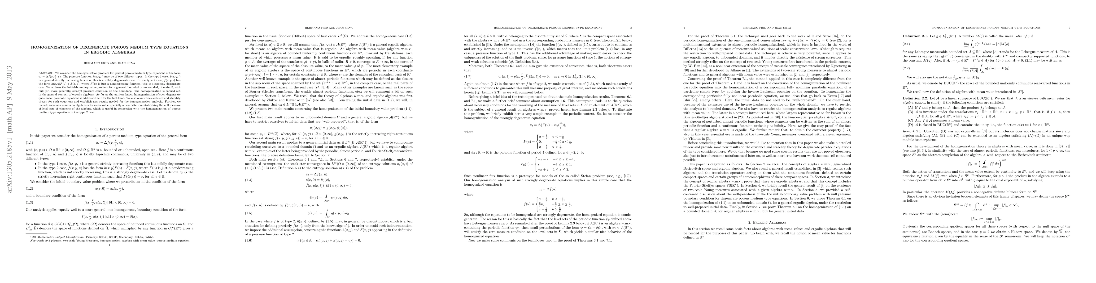 We consider the homogenization problem for general porous medium type equations of the form $u_t=\D f(x,\frac{x}{\ve}, u)$. The pressure function $f(x,y,\cdot)$ may be of two different types. In the type~1 case, $f(x,y,\cdot)$ is a general strictly increasing function; this is a mildly degenerate case. In the type~2 case, $f(x,y,\cdot)$ has the form $h(x,y)F(u)+S(x,y)$, where $F(u)$ is just a nondecreasing function; this is a strongly degenerate case. We address the initial-boundary value problem for a general, bounded or unbounded, domain $\Om$, with null (or, more generally, steady) pressure condition on the boundary. The homogenization is carried out in the general context of ergodic algebras. As far as the authors know, homogenization of such degenerate quasilinear parabolic equations is addressed here for the first time. We also review the existence and stability theory for such equations and establish new results needed for the homogenization analysis. Further, we include some new results on algebras with mean value, specially a new criterion establishing the null measure of level sets of elements of the algebra, which is useful in connection with the homogenization of porous medium type equations in the type~2 case.