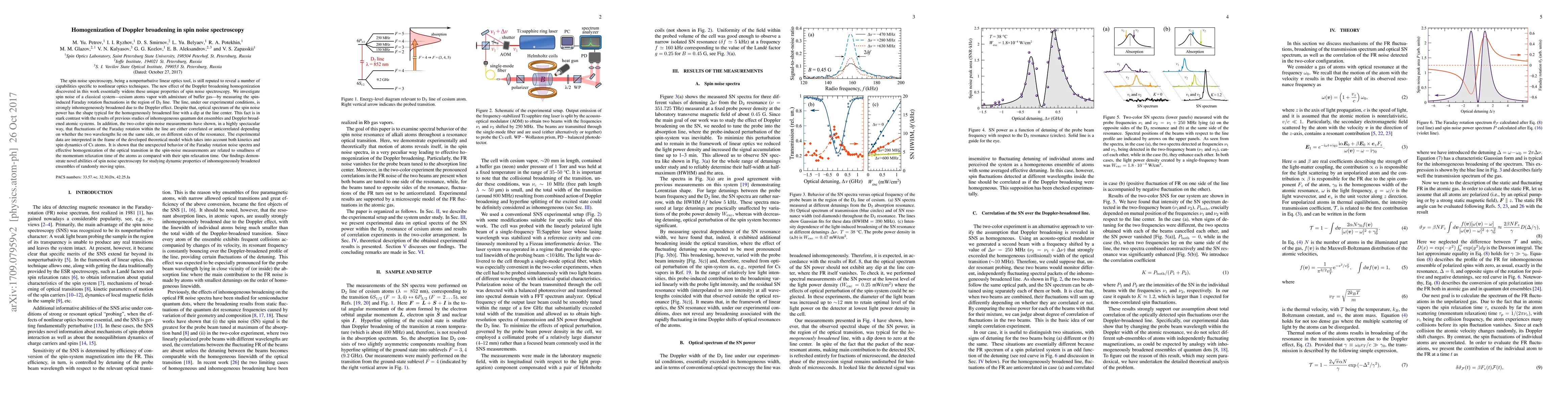 The spin noise of cesium atoms vapor with admixture of buffer gas is experimentally investigated by measuring the spin induced Faraday rotation fluctuations in the vicinity of D 2 line. The line, under these conditions, is known to be strongly inhomogeneously broadened due to the Doppler effect. Despite that, optical spectrum of the spin noise power, as we have found, has the characteristic shape of the homogeneously broadened line with the dip at the line center. This fact is in stark contrast with the results of previous studies of inhomogeneous quantum dot ensembles. In addition, the two-color experiments, where correlations of the Faraday rotation fluctuations for two probe wavelengths were measured, have shown, in a highly spectacular way, that these fluctuations are either correlated, or anticorrelated depending on whether the two wavelengths lie on the same side, or on different sides of the resonance. The experimental data are explained within the developed theoretical model which takes into account both kinetics and spin dynamics of Cs atoms. It is shown that the unexpected behavior of the optical Faraday rotation noise spectra and effective homogenization of the optical transition in the spin-noise measurements are related to smallness of the momentum relaxation time of the atoms as compared with their spin relaxation time.