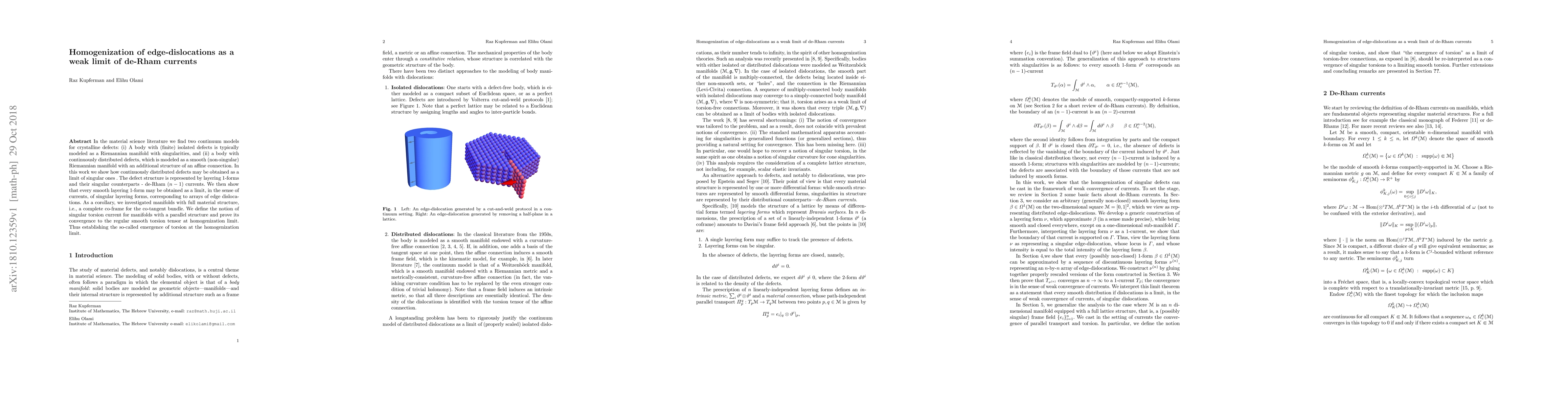 The paper introduces a novel approach to represent and analyze continuously distributed defects as a weak limit of singular edge dislocations using de-Rham currents, providing a rigorous mathematical foundation for understanding the emergence of torsion in homogenization limits.