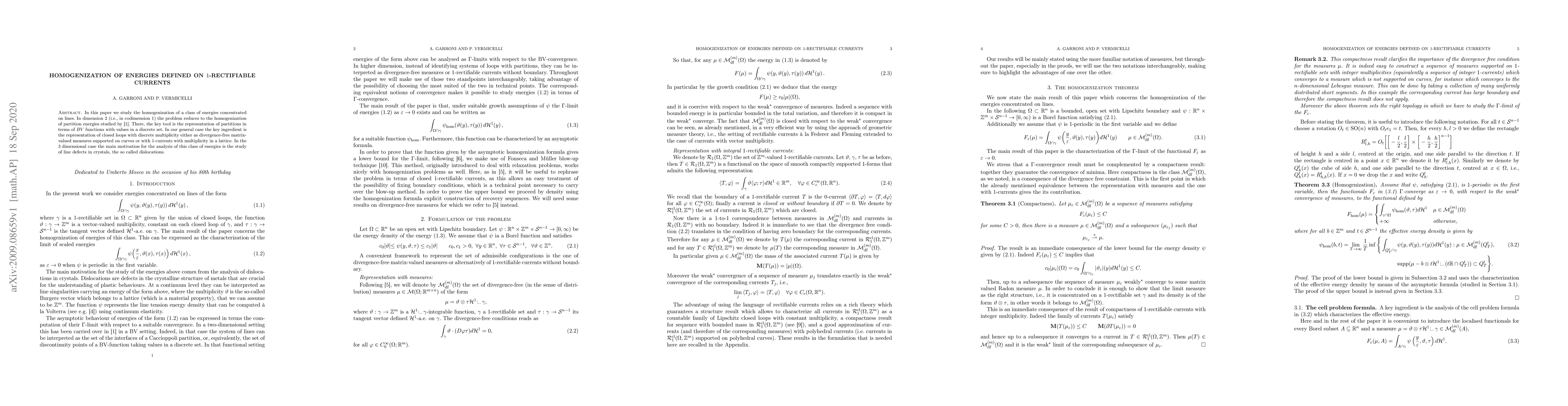 This paper explores the homogenization of energies focused on lines, with a key application in understanding dislocations or line defects in 3D crystals. In 2D, it connects to partition energies via BV functions with discrete values; in 3D, it utilizes divergence-free matrix-valued measures or 1-currents with lattice multiplicity.