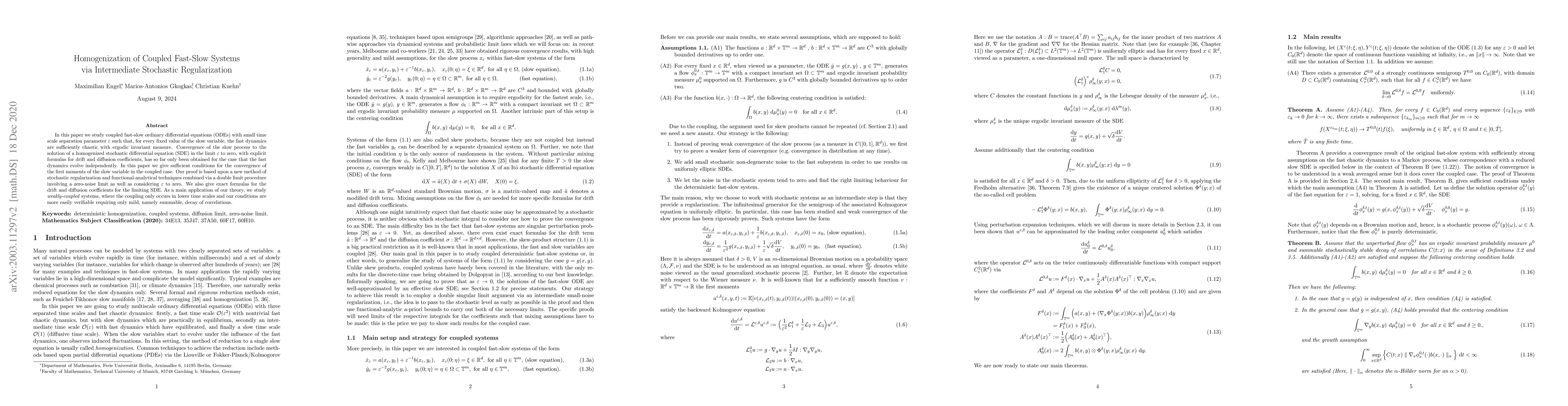 In this paper we study coupled fast-slow ordinary differential equations (ODEs) with small time scale separation parameter $\epsilon$ such that, for every fixed value of the slow variable, the fast dynamics are sufficiently chaotic with ergodic invariant measure. Convergence of the slow process to the solution of a homogenized stochastic differential equation (SDE) in the limit $\epsilon$ to zero, with explicit formulas for drift and diffusion coefficients, has so far only been obtained for the case that the fast dynamics evolve independently. In this paper we give sufficient conditions for the convergence of the first moments of the slow variable in the coupled case. Our proof is based upon a new method of stochastic regularization and functional-analytical techniques combined via a double limit procedure involving a zero-noise limit as well as considering $\epsilon$ to zero. We also give exact formulas for the drift and diffusion coefficients for the limiting SDE. As a main application of our theory, we study \emph{weakly-coupled} systems, where the coupling only occurs in lower time scales and our conditions are more easily verifiable requiring only mild, namely summable, decay of correlations.