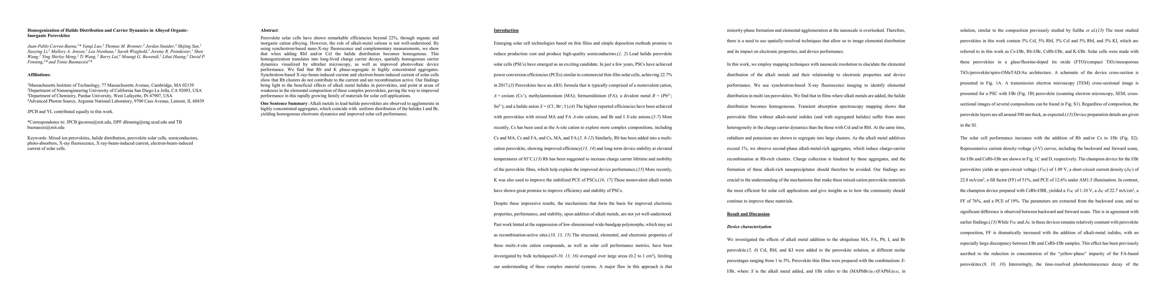 This research uses synchrotron-based techniques to show that adding rubidium and caesium iodide to organic-inorganic perovskites creates a homogenous halide distribution. This homogenization leads to longer-lasting charge carriers and better solar cell performance, although rubidium clusters are found to be non-conductive and prone to recombination.