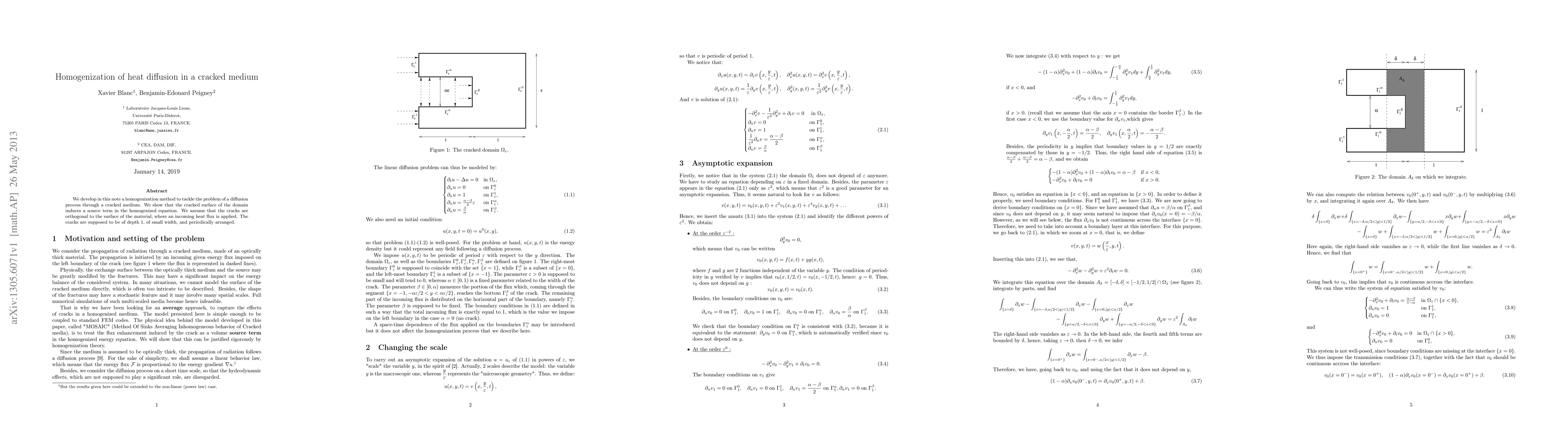 This research introduces a homogenization method for heat diffusion in cracked media, revealing that crack surfaces generate a source term in the simplified equation. The method assumes cracks perpendicular to the material's surface, with consistent depth and small width, arranged periodically.