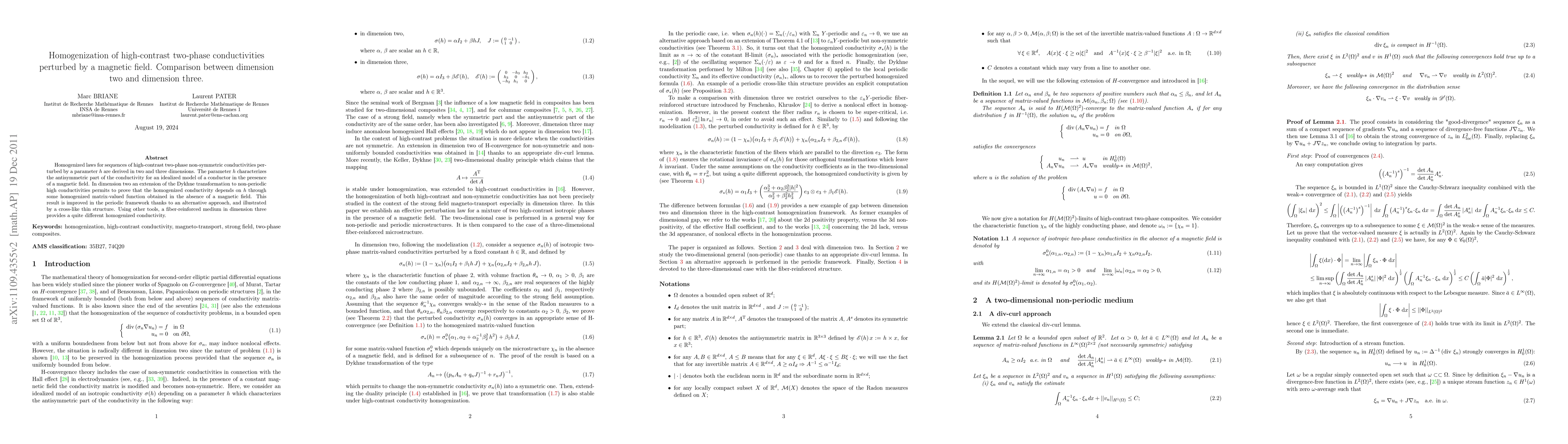 Homogenized laws for sequences of high-contrast two-phase non-symmetric conductivities perturbed by a parameter $h$ are derived in two and three dimensions. The parameter $h$ characterizes the antisymmetric part of the conductivity for an idealized model of a conductor in the presence of a magnetic field. In dimension two an extension of the Dykhne transformation to non-periodic high conductivities permits to prove that the homogenized conductivity depends on $h$ through some homogenized matrix-valued function obtained in the absence of a magnetic field. This result is improved in the periodic framework thanks to an alternative approach, and illustrated by a cross-like thin structure. Using other tools, a fiber-reinforced medium in dimension three provides a quite different homogenized conductivity.