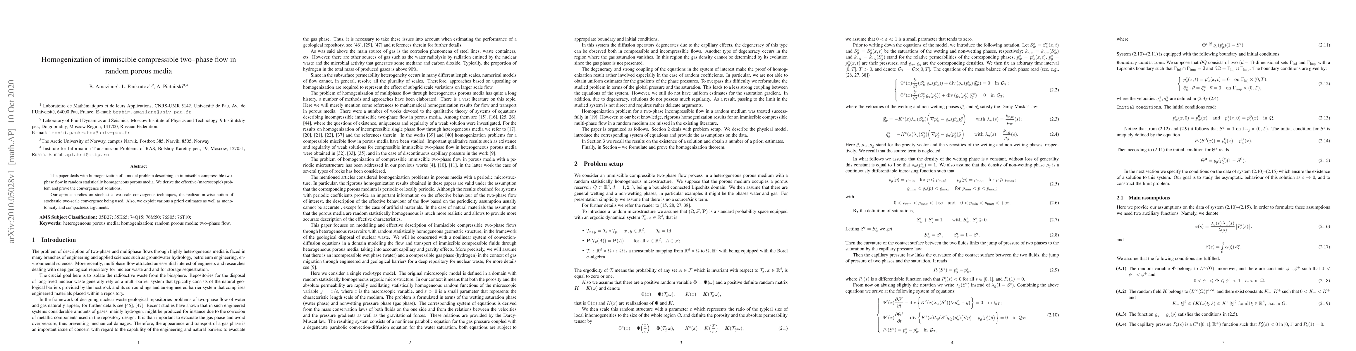 This paper derives the effective macroscopic model for immiscible compressible two-phase flow in random porous media, proving the convergence of solutions using stochastic two-scale convergence techniques and leveraging a priori estimates, monotonicity, and compactness arguments.