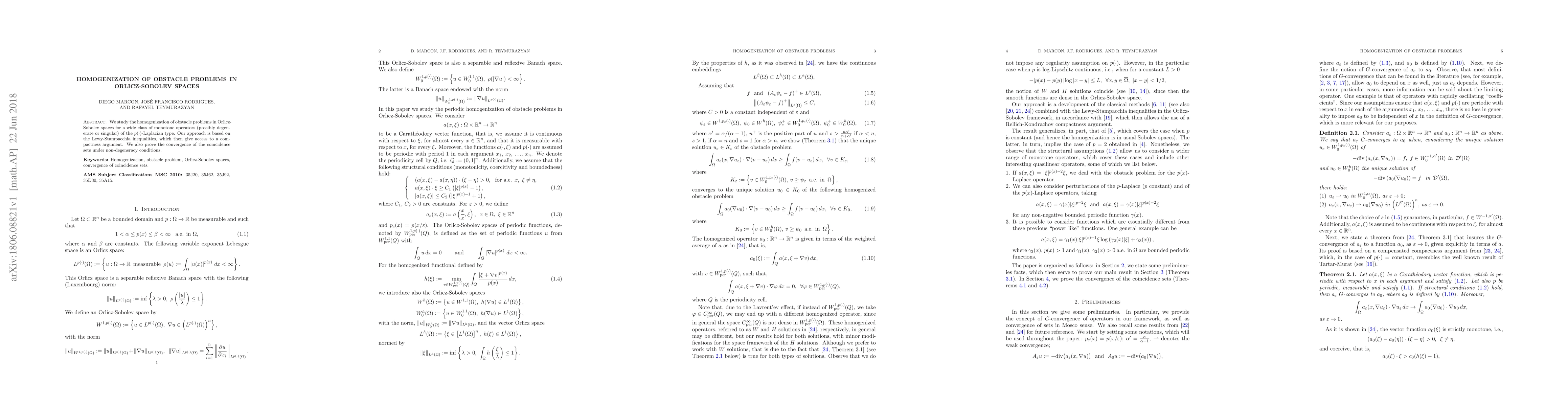This paper explores the homogenization of obstacle problems in Orlicz-Sobolev spaces using Lewy-Stampacchia inequalities for $p(\cdot)$-Laplacian type operators, establishing compactness and convergence of coincidence sets under non-degeneracy conditions.