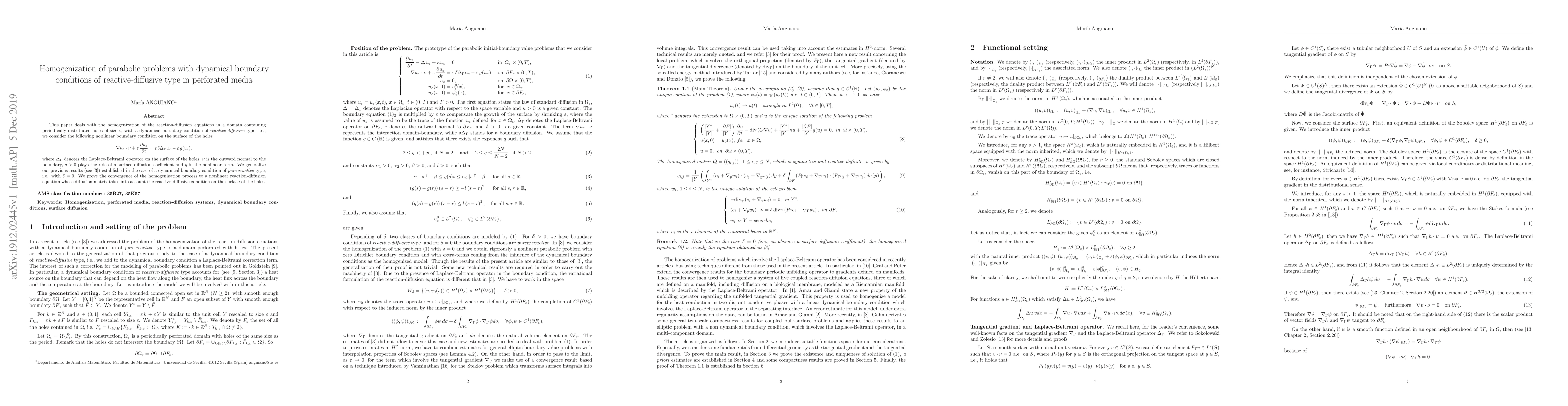 This paper studies the homogenization of reaction-diffusion equations in perforated domains with reactive-diffusive dynamical boundary conditions, proving convergence to a nonlinear equation that incorporates surface diffusion and reaction effects. The results generalize previous findings for purely reactive boundary conditions.