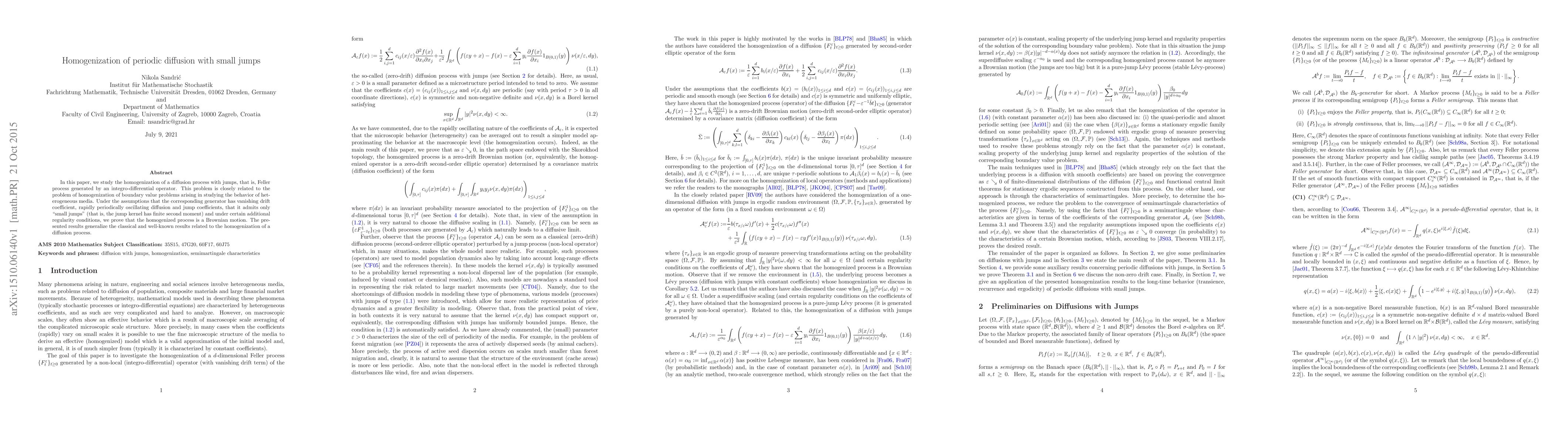 This paper investigates the homogenization of a diffusion process with small jumps, showing that under specific conditions, the homogenized process converges to Brownian motion. The results extend classical homogenization theories for diffusion processes.