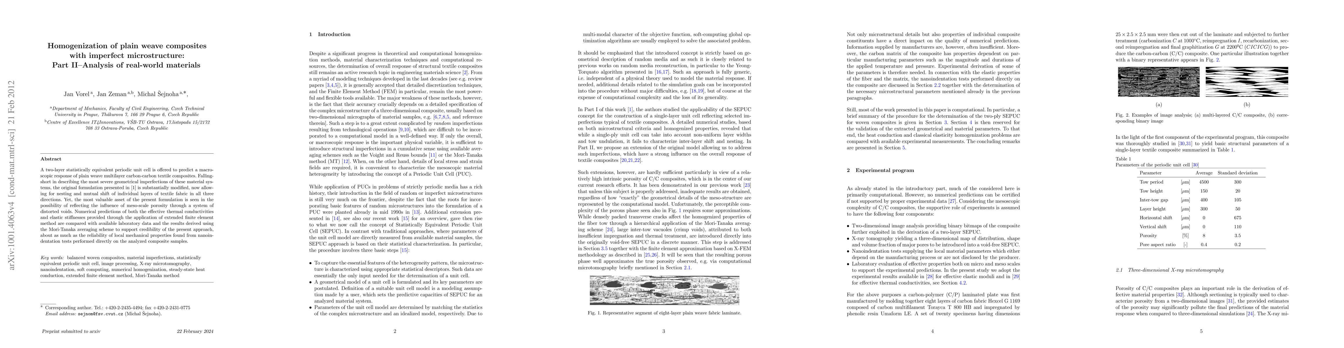 A two-layer statistically equivalent periodic unit cell is offered to predict a macroscopic response of plain weave multilayer carbon-carbon textile composites. Falling-short in describing the most typical geometrical imperfections of these material systems the original formulation presented in (Zeman and \v{S}ejnoha, International Journal of Solids and Structures, 41 (2004), pp. 6549--6571) is substantially modified, now allowing for nesting and mutual shift of individual layers of textile fabric in all three directions. Yet, the most valuable asset of the present formulation is seen in the possibility of reflecting the influence of negligible meso-scale porosity through a system of oblate spheroidal voids introduced in between the two layers of the unit cell. Numerical predictions of both the effective thermal conductivities and elastic stiffnesses and their comparison with available laboratory data and the results derived using the Mori-Tanaka averaging scheme support credibility of the present approach, about as much as the reliability of local mechanical properties found from nanoindentation tests performed directly on the analyzed composite samples.