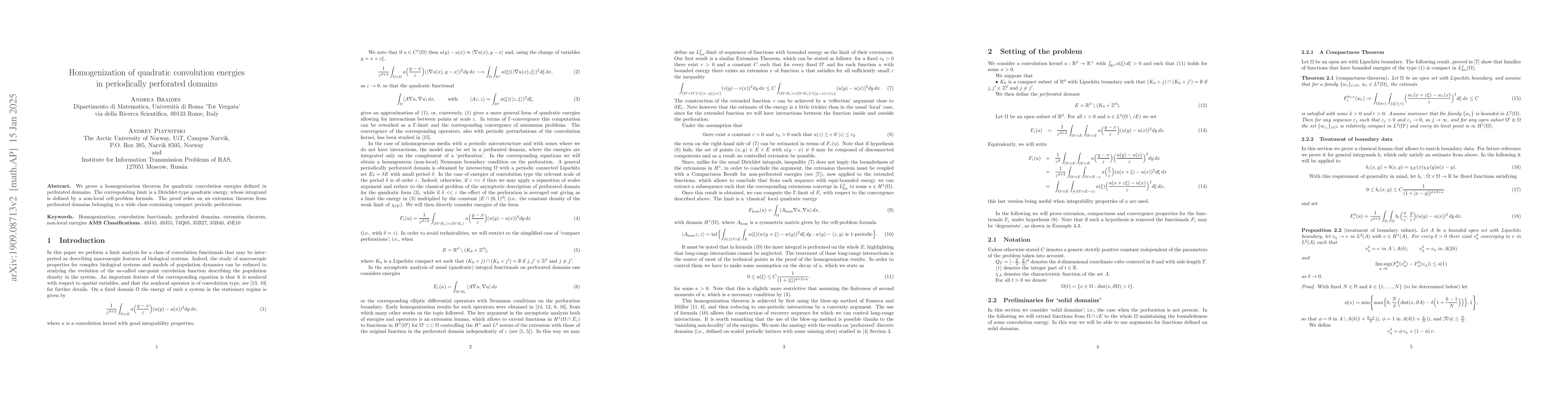Summary: This paper proves a homogenization theorem for quadratic convolution energies in periodically perforated domains, showing that the limit converges to a Dirichlet-type quadratic energy determined by a non-local cell-problem formula. The proof utilizes an extension theorem applicable to a broad class of such domains.